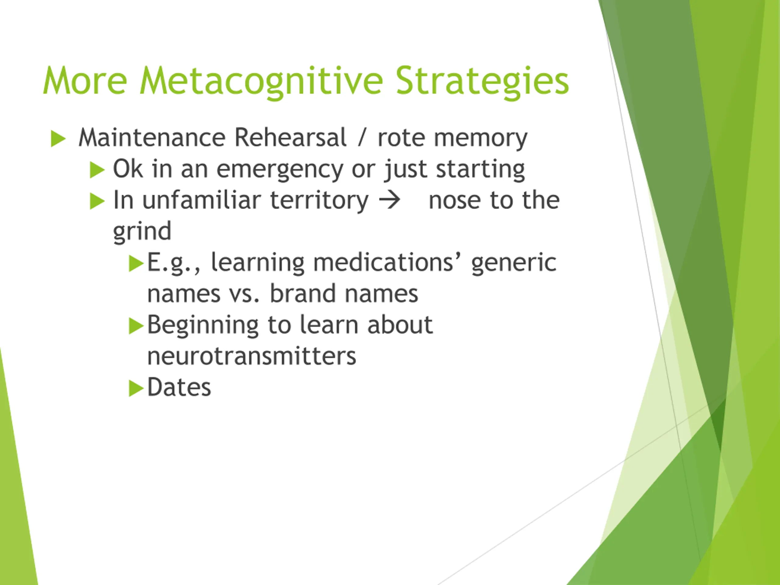 More Metacognitive Strategies Maintenance Rehearsal / rote memory Ok in an emergency or just starting In unfamiliar territory nose to the grind E.g., learning medications generic names vs. brand names Beginning to learn about neurotransmitters Dates