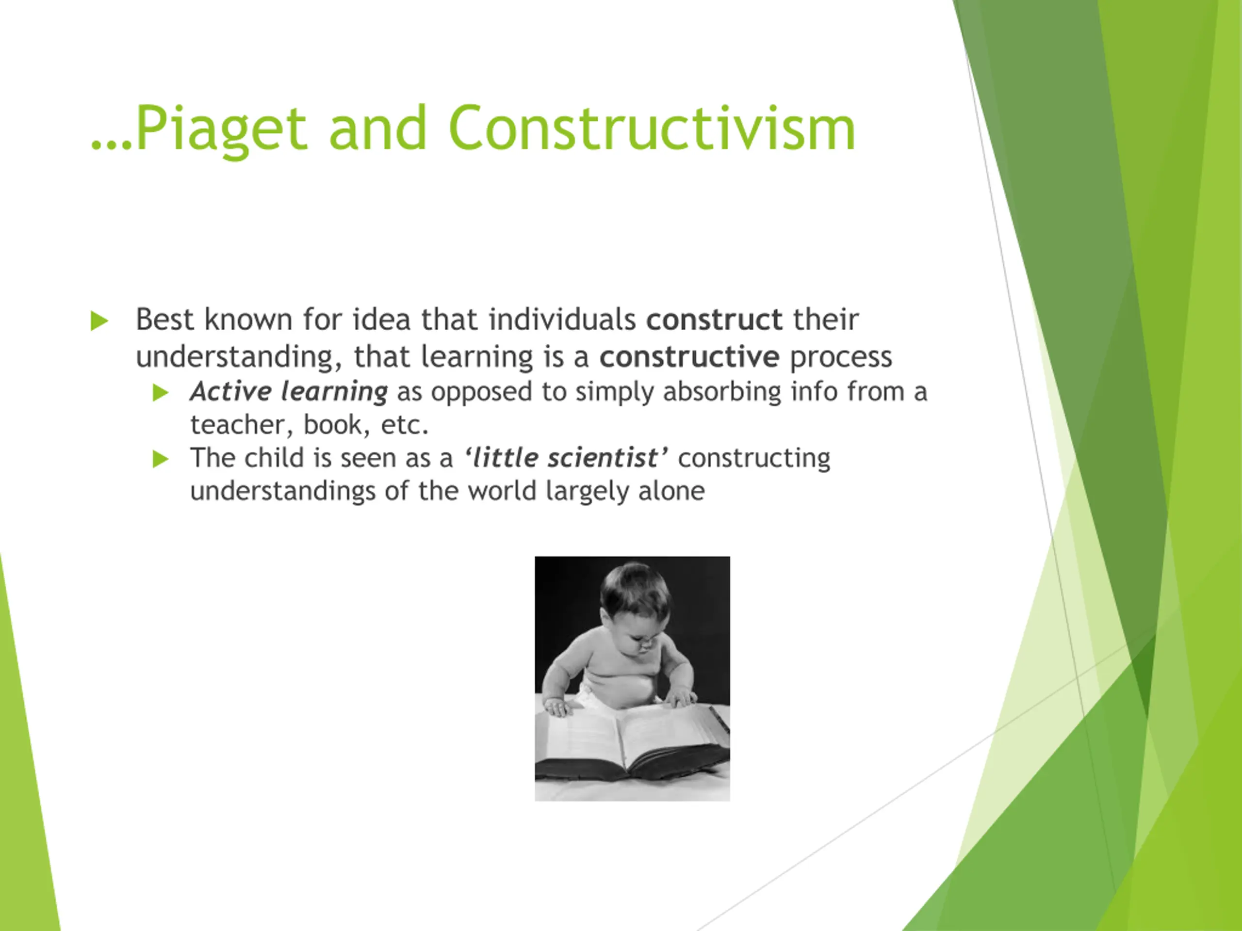 Piaget and Constructivism Best known for idea that individuals construct their understanding, that learning is a constructive process Active learning as opposed to simply absorbing info from a teacher, book, etc. The child is seen as a little scientist constructing understandings of the world largely alone