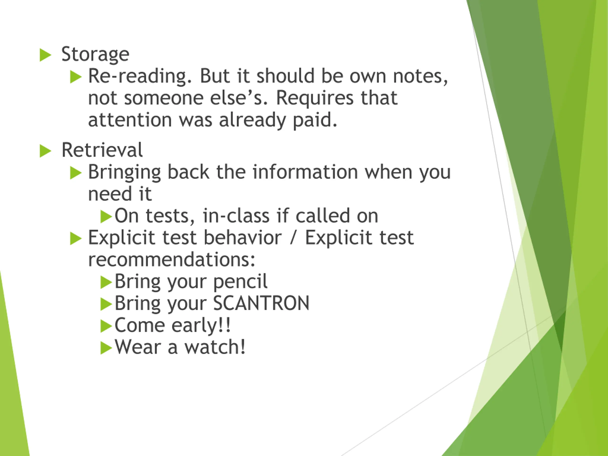 Storage Re-reading. But it should be own notes, not someone else s. Requires that attention was already paid. Retrieval Bringing back the information when you need it On tests, in-class if called on Explicit test behavior / Explicit test recommendations: Bring your pencil Bring your SCANTRON Come early!! Wear a watch!