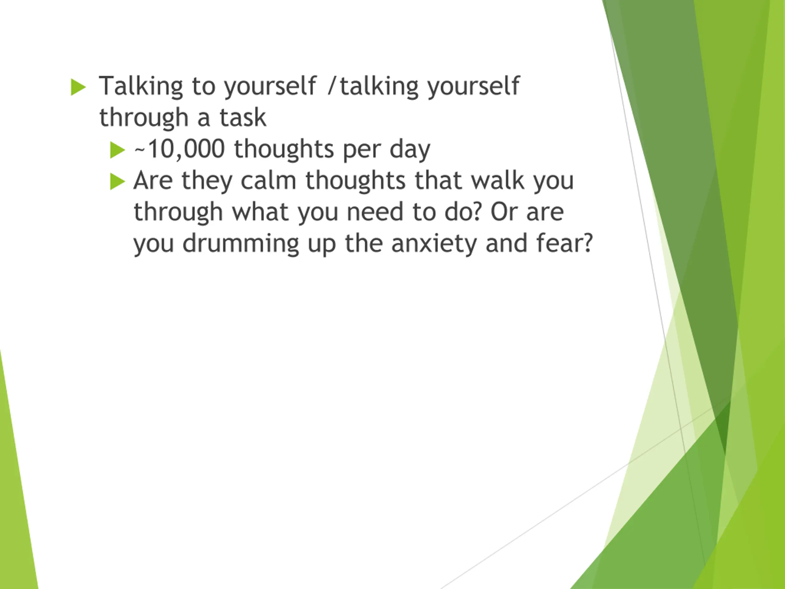 Talking to yourself /talking yourself through a task ~10,000 thoughts per day Are they calm thoughts that walk you through what you need to do? Or are you drumming up the anxiety and fear?