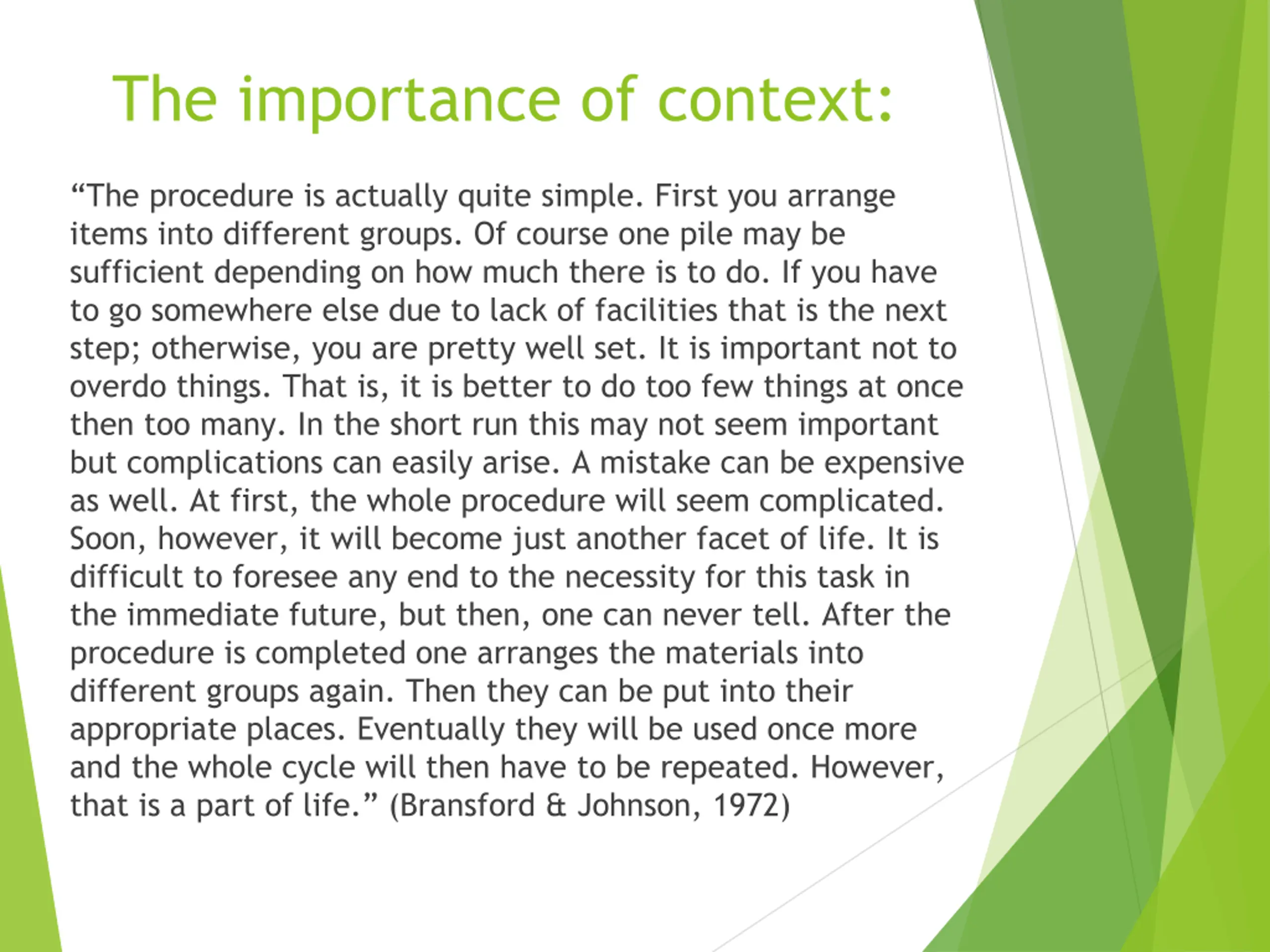 The importance of context: The procedure is actually quite simple. First you arrange items into different groups. Of course one pile may be sufficient depending on how much there is to do. If you have to go somewhere else due to lack of facilities that is the next step; otherwise, you are pretty well set. It is important not to overdo things. That is, it is better to do too few things at once then too many. In the short run this may not seem important but complications can easily arise. A mistake can be expensive as well. At first, the whole procedure will seem complicated. Soon, however, it will become just another facet of life. It is difficult to foresee any end to the necessity for this task in the immediate future, but then, one can never tell. After the procedure is completed one arranges the materials into different groups again. Then they can be put into their appropriate places. Eventually they will be used once more and the whole cycle will then have to be repeated. However, that is a part of life. (Bransford & Johnson, 1972)