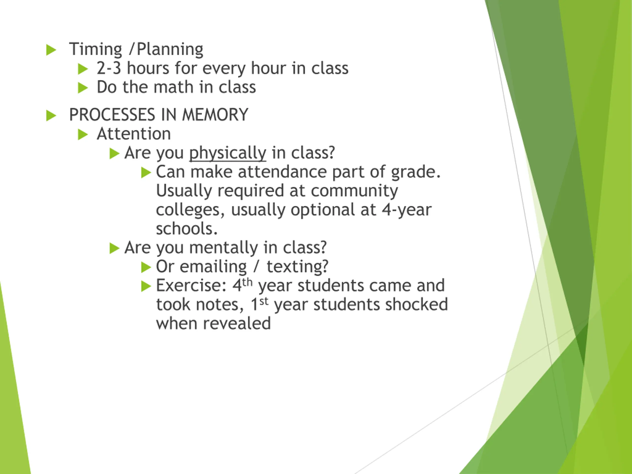 Timing /Planning 2-3 hours for every hour in class Do the math in class PROCESSES IN MEMORY Attention Are you physically in class? Can make attendance part of grade. Usually required at community colleges, usually optional at 4-year schools. Are you mentally in class? Or emailing / texting? Exercise: 4th year students came and took notes, 1st year students shocked when revealed