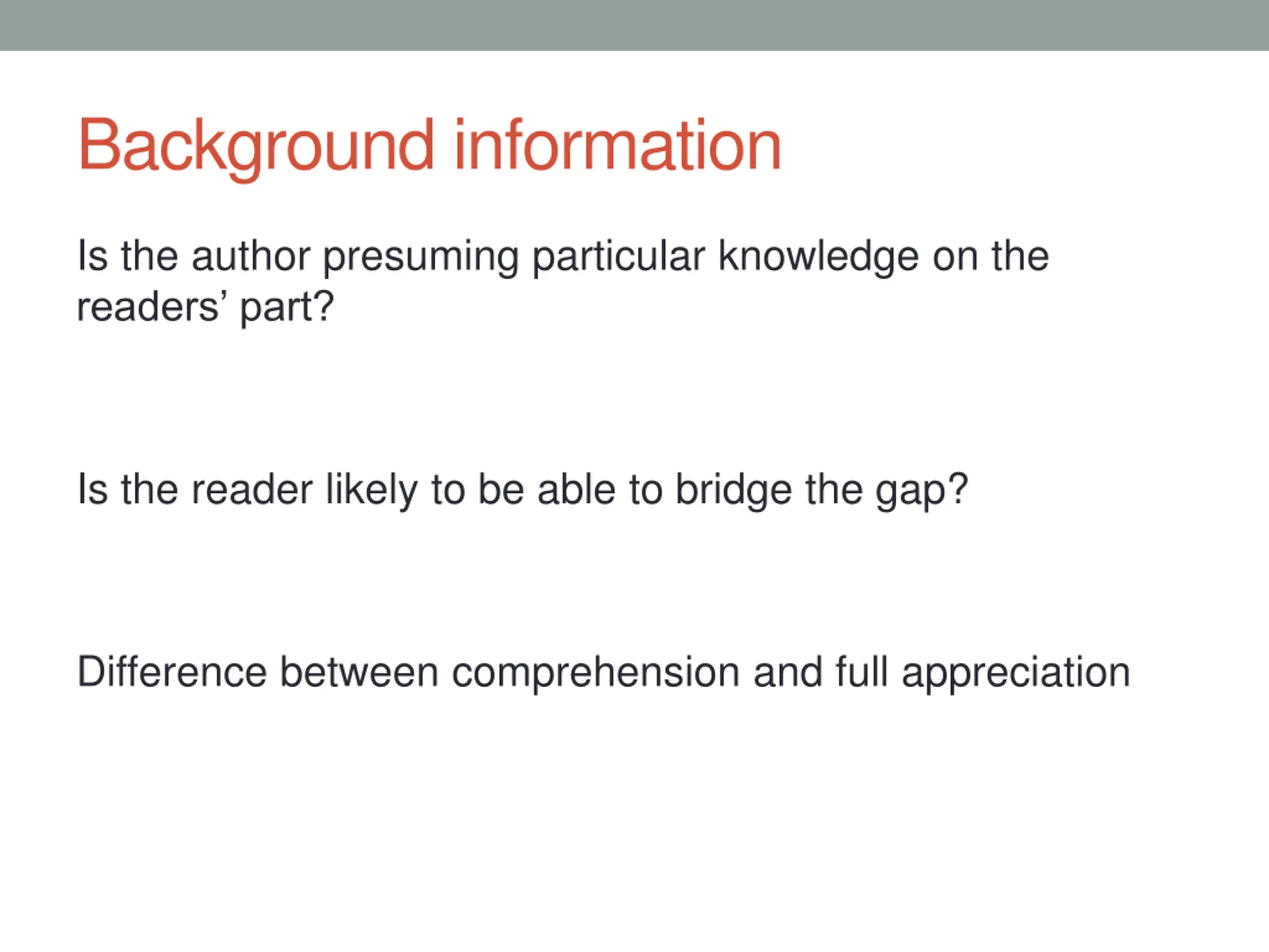 Background information Is the author presuming particular knowledge on the readers part? Is the reader likely to be able to bridge the gap? Difference between comprehension and full appreciation