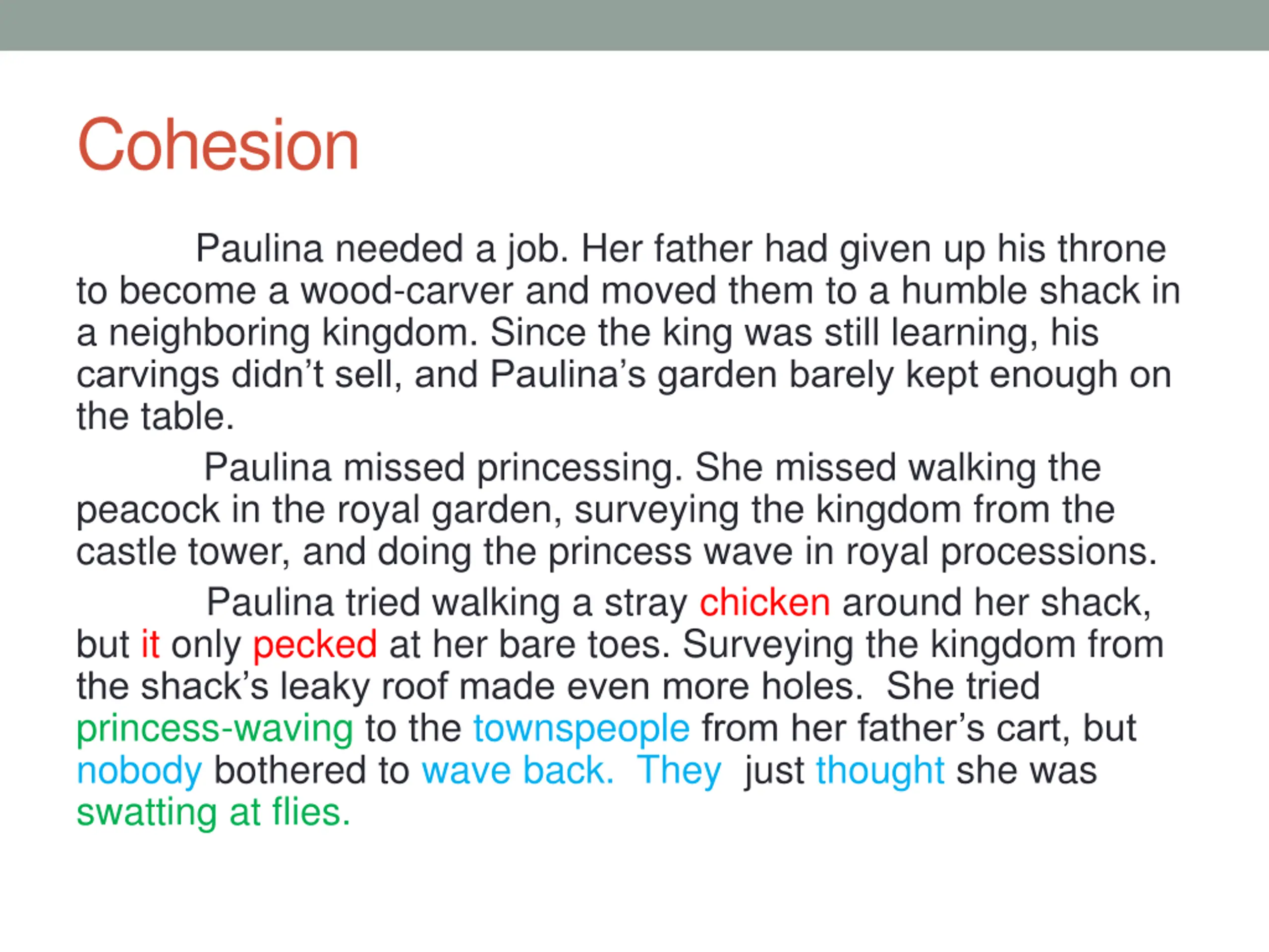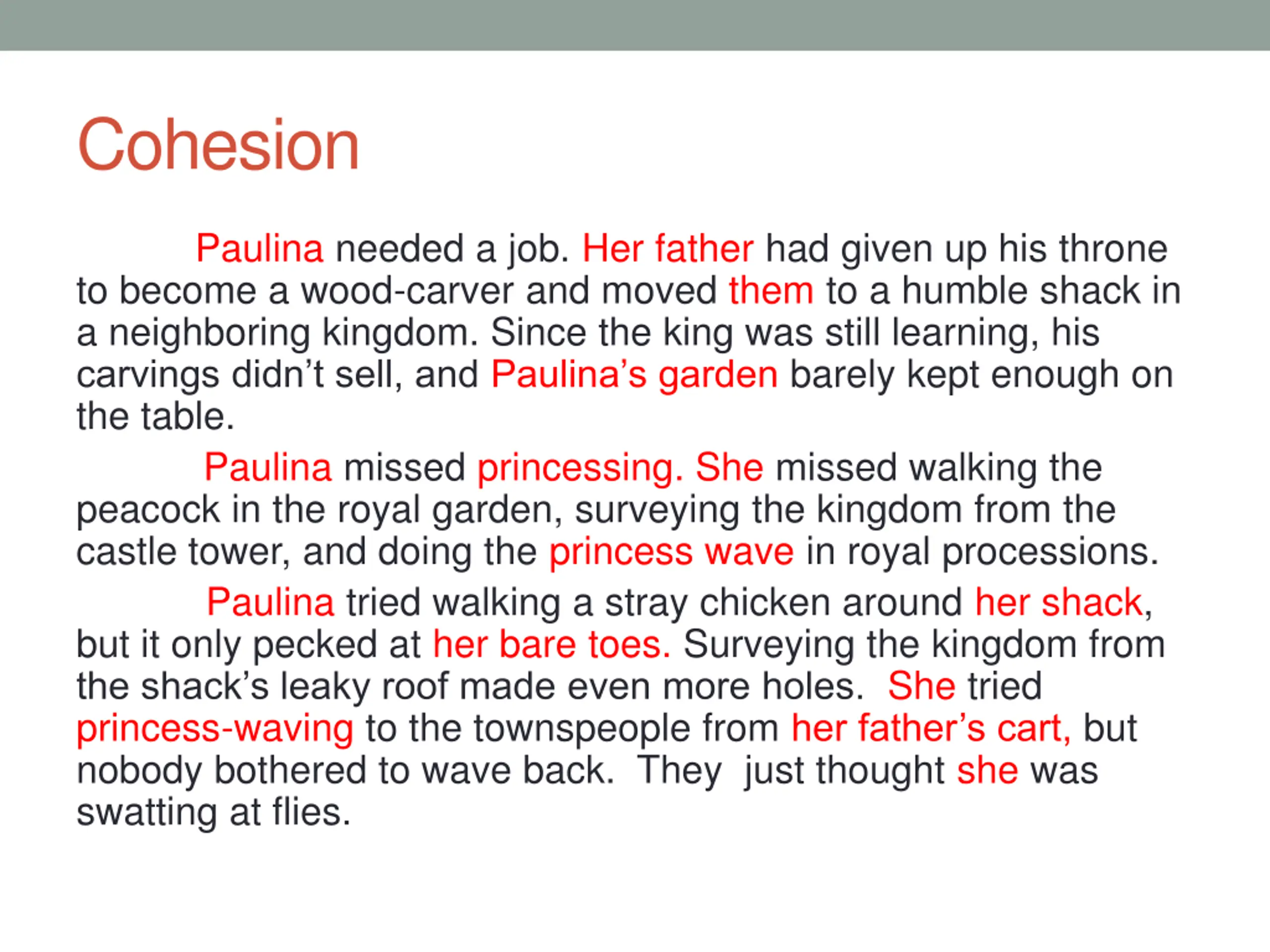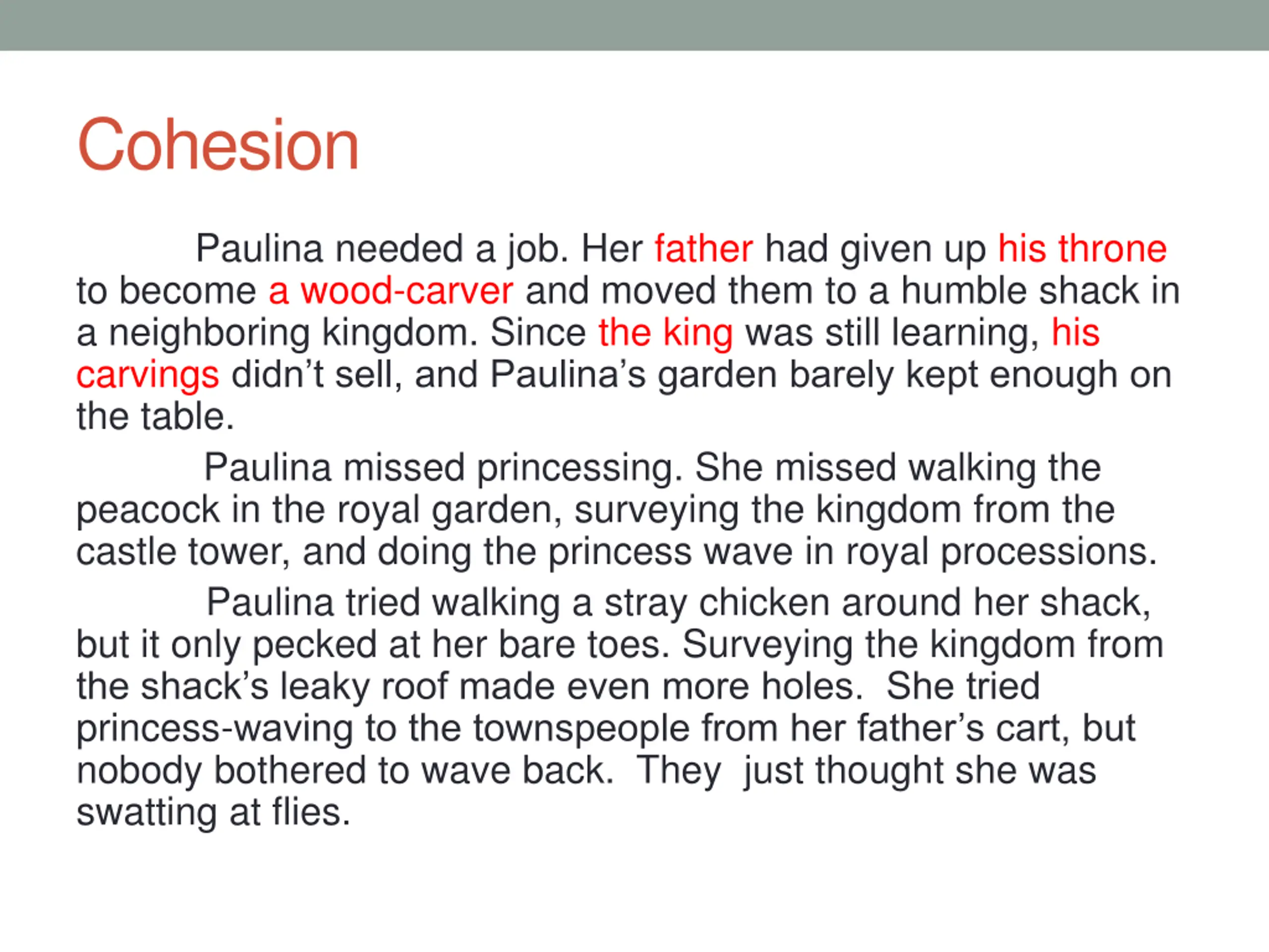 Cohesion: Synonyms Paulina = her = princess = she Father = his = wood-carver Paulina and father = them Chicken = it Princessing = walking the peacock in the royal garden = surveying the kingdom from the castle tower = doing the princess wave in royal processions Townspeople = they