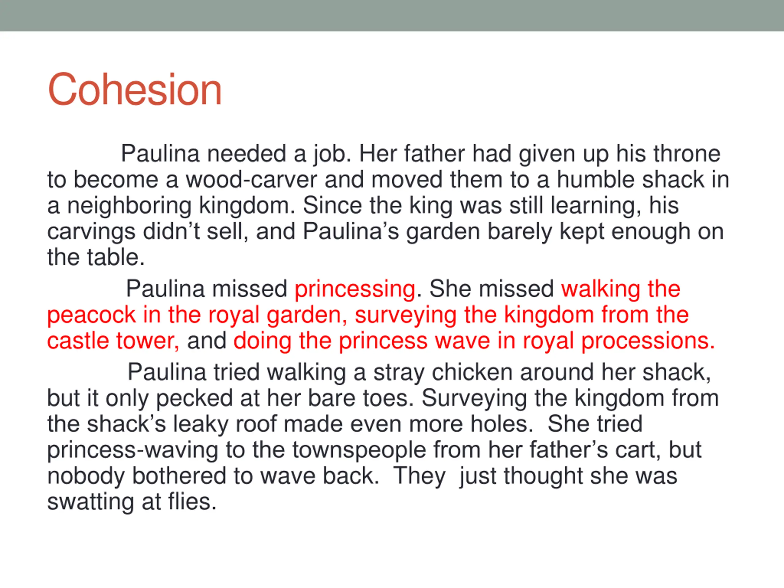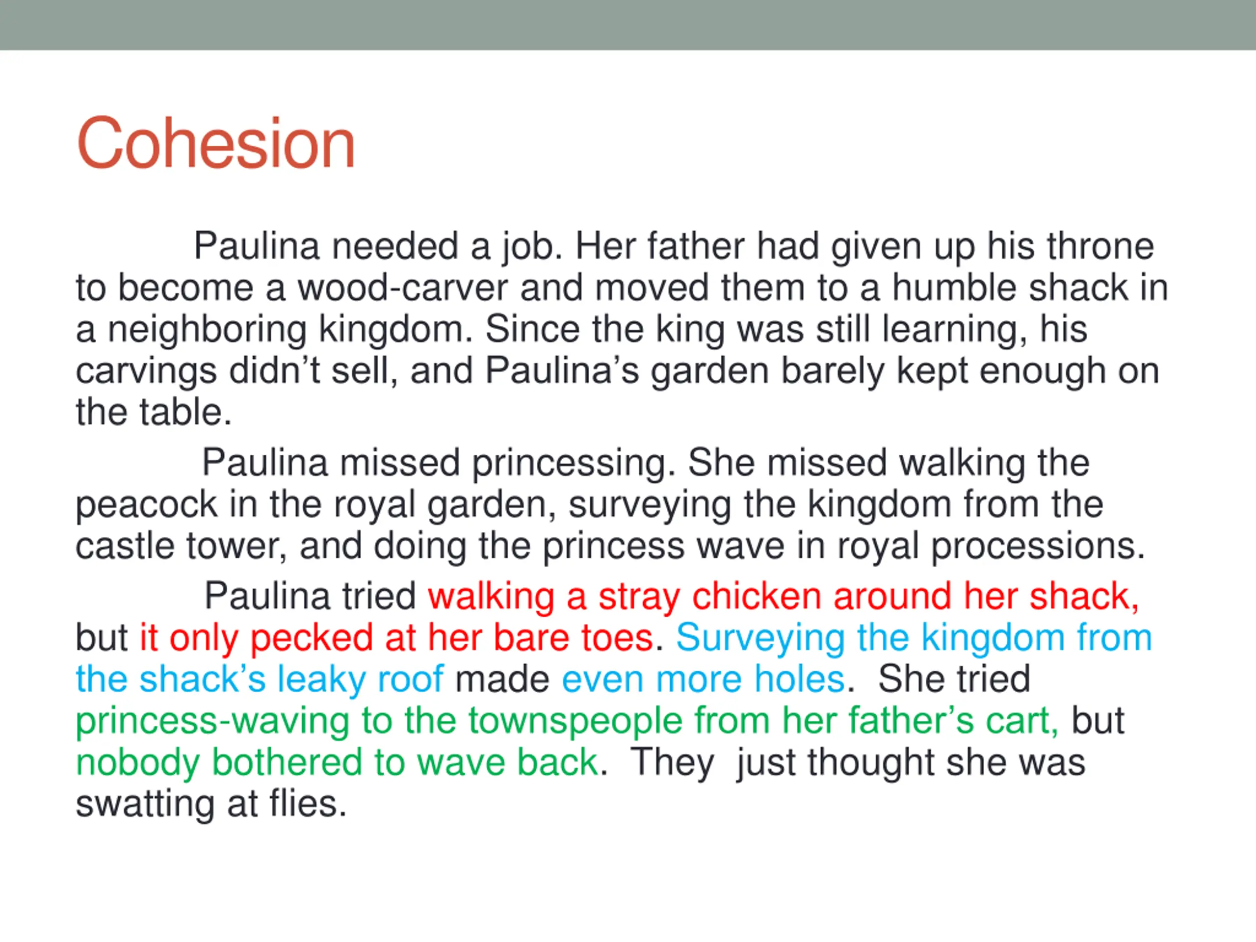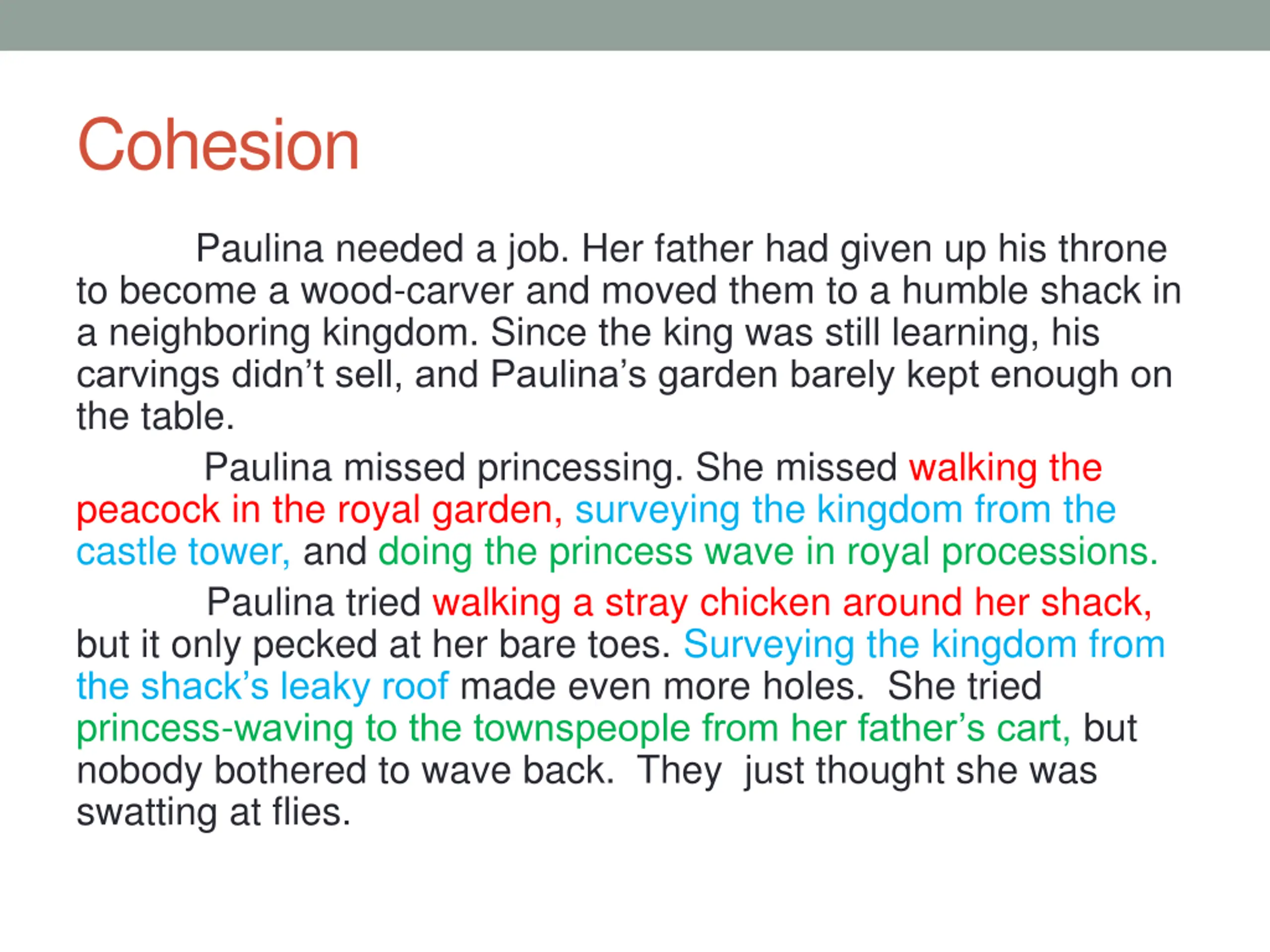 Cohesion: Synonyms Paulina = her = princess = she Father = his = wood-carver Paulina and father = them Chicken = it Princessing = walking the peacock in the royal garden = surveying the kingdom from the castle tower = doing the princess wave in royal processions Townspeople = they
