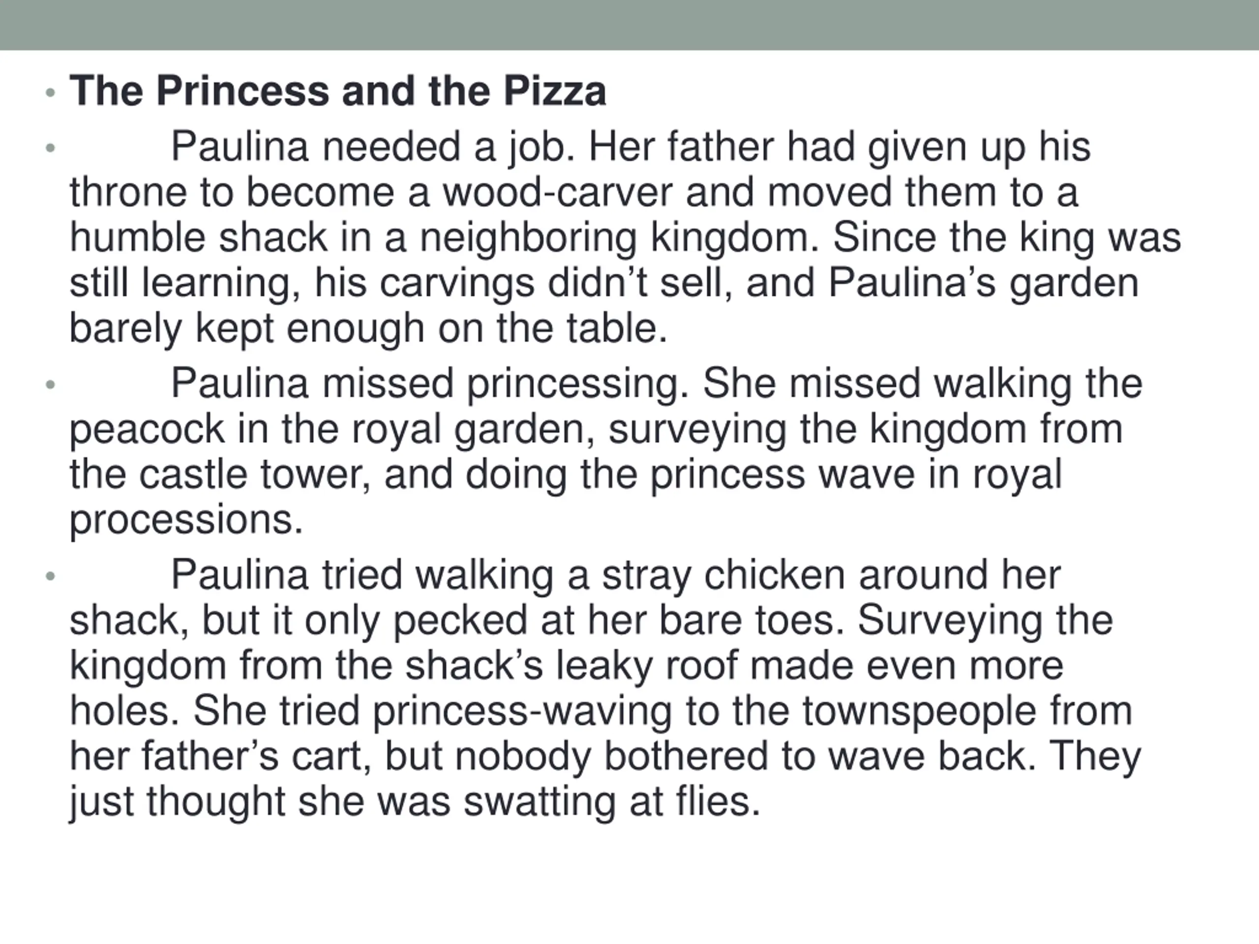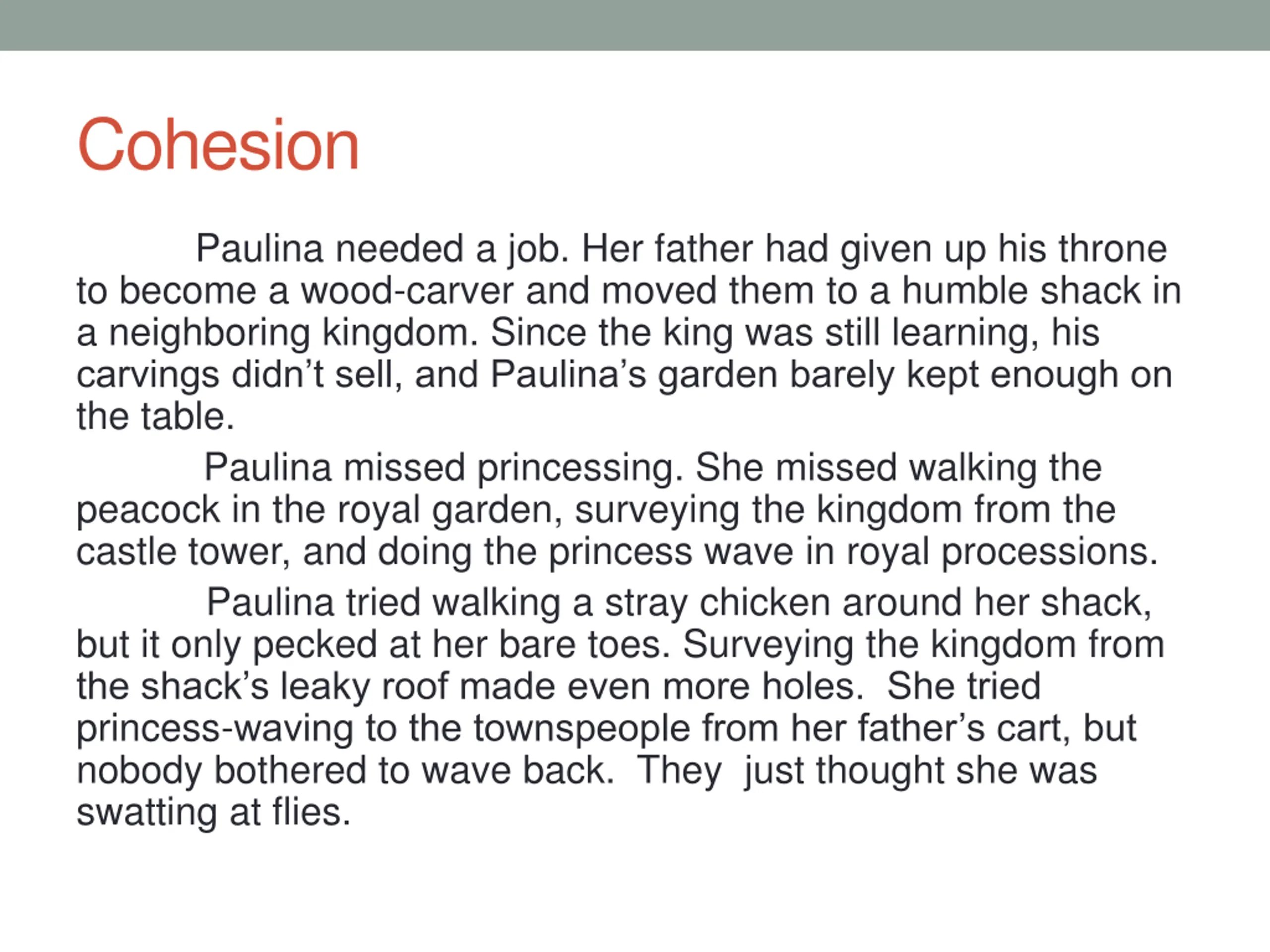 Cohesion Paulina needed a job. Her father had given up his throne to become a wood-carver and moved them to a humble shack in a neighboring kingdom. Since the king was still learning, his carvings didn t sell, and Paulina s garden barely kept enough on the table. Paulina missed princessing. She missed walking the peacock in the royal garden, surveying the kingdom from the castle tower, and doing the princess wave in royal processions. Paulina tried walking a stray chicken around her shack, but it only pecked at her bare toes. Surveying the kingdom from the shack s leaky roof made even more holes. She tried princess-waving to the townspeople from her father s cart, but nobody bothered to wave back. They just thought she was swatting at flies.