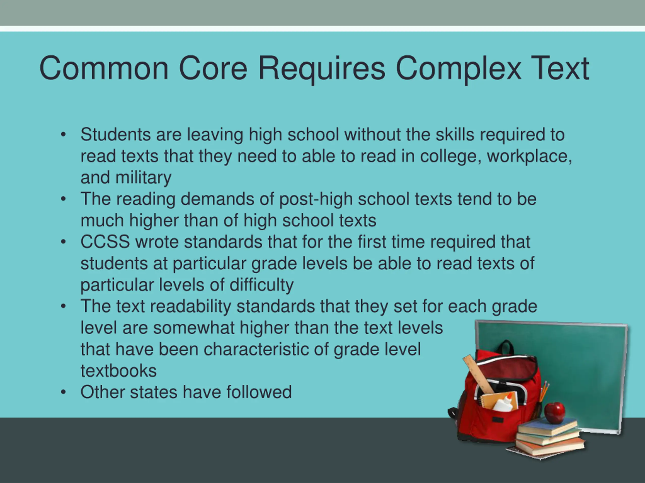 Common Core Requires Complex Text Students are leaving high school without the skills required to read texts that they need to able to read in college, workplace, and military The reading demands of post-high school texts tend to be much higher than of high school texts CCSS wrote standards that for the first time required that students at particular grade levels be able to read texts of particular levels of difficulty The text readability standards that they set for each grade level are somewhat higher than the text levels that have been characteristic of grade level textbooks Other states have followed