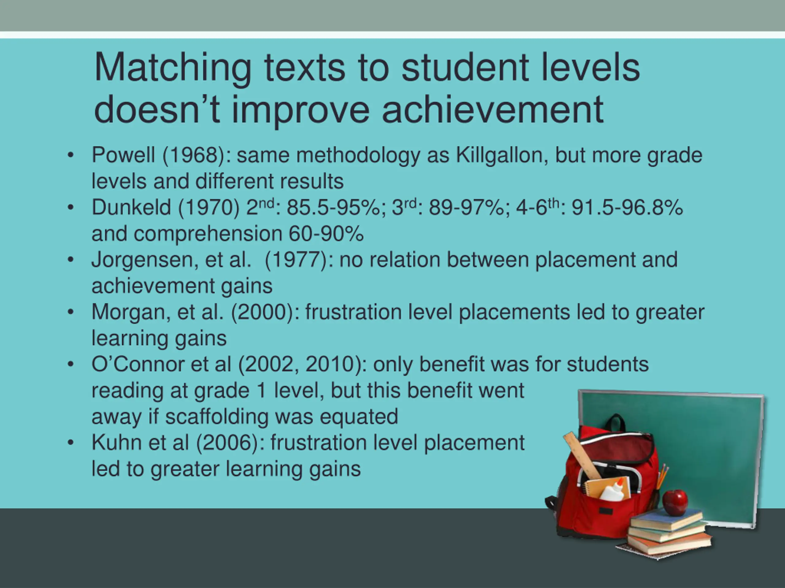 Matching texts to student levels doesn t improve achievement Powell (1968): same methodology as Killgallon, but more grade levels and different results Dunkeld (1970) 2nd: 85.5-95%; 3rd: 89-97%; 4-6th: 91.5-96.8% and comprehension 60-90% Jorgensen, et al. (1977): no relation between placement and achievement gains Morgan, et al. (2000): frustration level placements led to greater learning gains O Connor et al (2002, 2010): only benefit was for students reading at grade 1 level, but this benefit went away if scaffolding was equated Kuhn et al (2006): frustration level placement led to greater learning gains