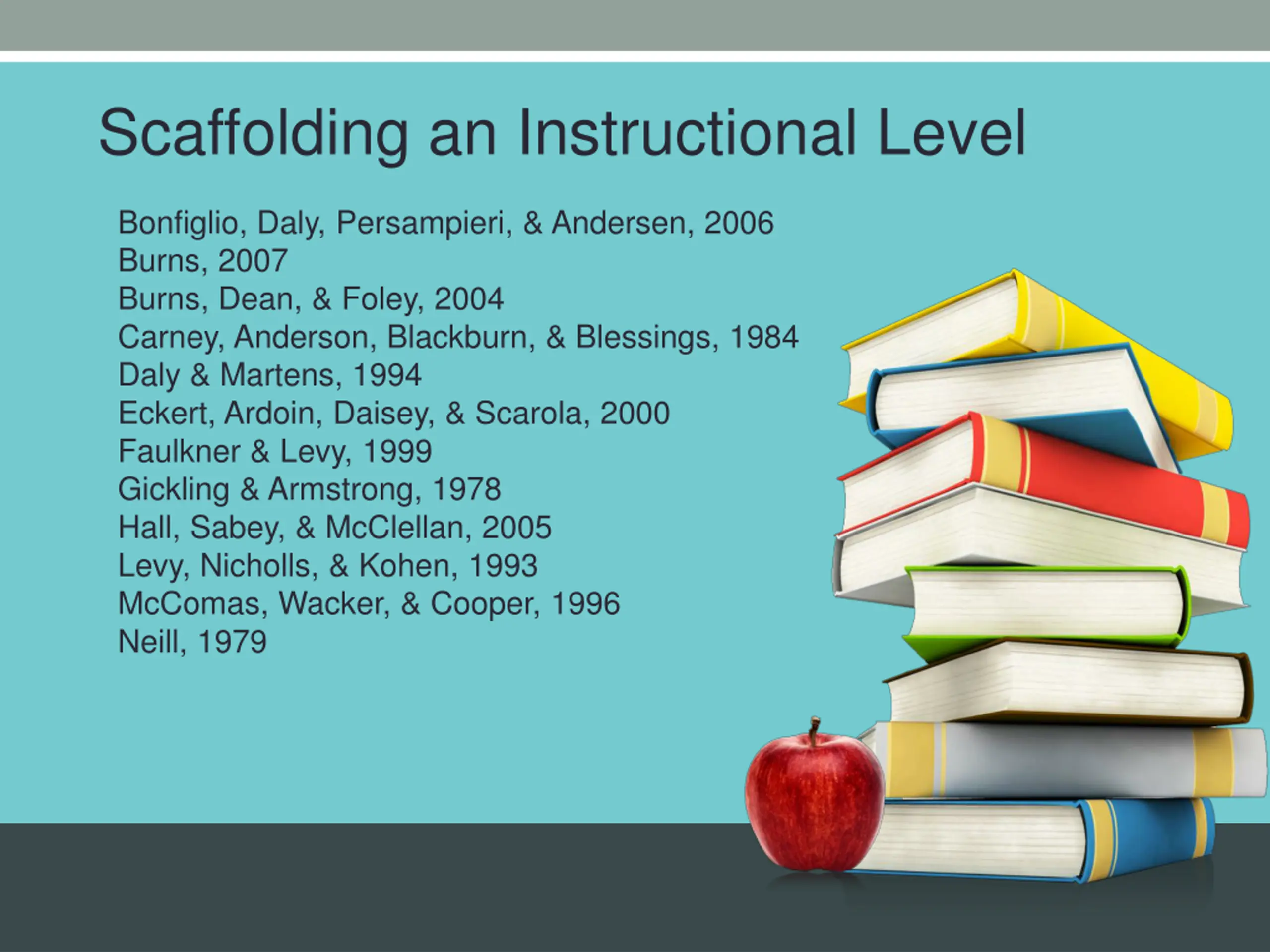Scaffolding an Instructional Level Bonfiglio, Daly, Persampieri, & Andersen, 2006 Burns, 2007 Burns, Dean, & Foley, 2004 Carney, Anderson, Blackburn, & Blessings, 1984 Daly & Martens, 1994 Eckert, Ardoin, Daisey, & Scarola, 2000 Faulkner & Levy, 1999 Gickling & Armstrong, 1978 Hall, Sabey, & McClellan, 2005 Levy, Nicholls, & Kohen, 1993 McComas, Wacker, & Cooper, 1996 Neill, 1979