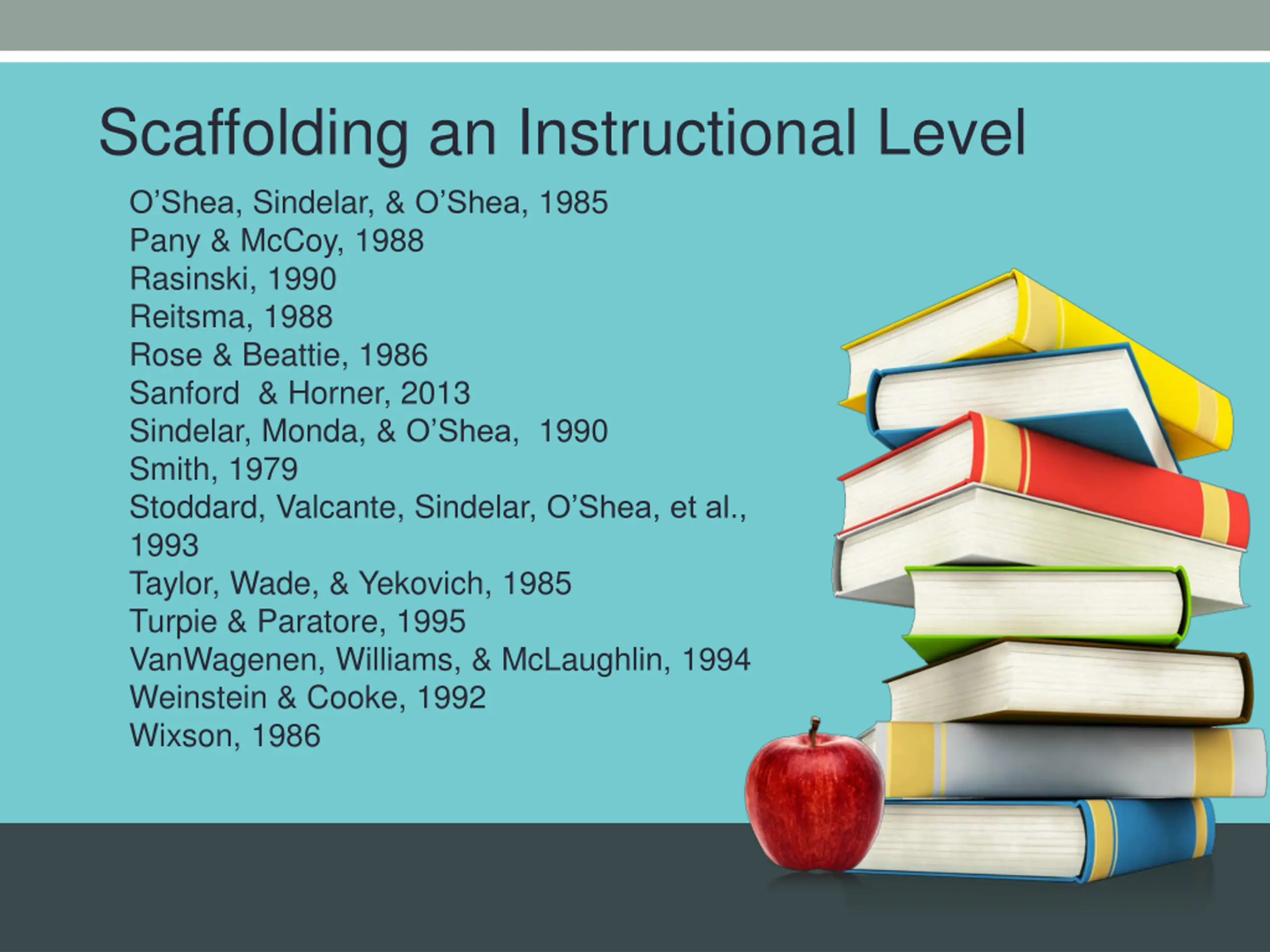 Scaffolding an Instructional Level O Shea, Sindelar, & O Shea, 1985 Pany & McCoy, 1988 Rasinski, 1990 Reitsma, 1988 Rose & Beattie, 1986 Sanford & Horner, 2013 Sindelar, Monda, & O Shea, 1990 Smith, 1979 Stoddard, Valcante, Sindelar, O Shea, et al., 1993 Taylor, Wade, & Yekovich, 1985 Turpie & Paratore, 1995 VanWagenen, Williams, & McLaughlin, 1994 Weinstein & Cooke, 1992 Wixson, 1986