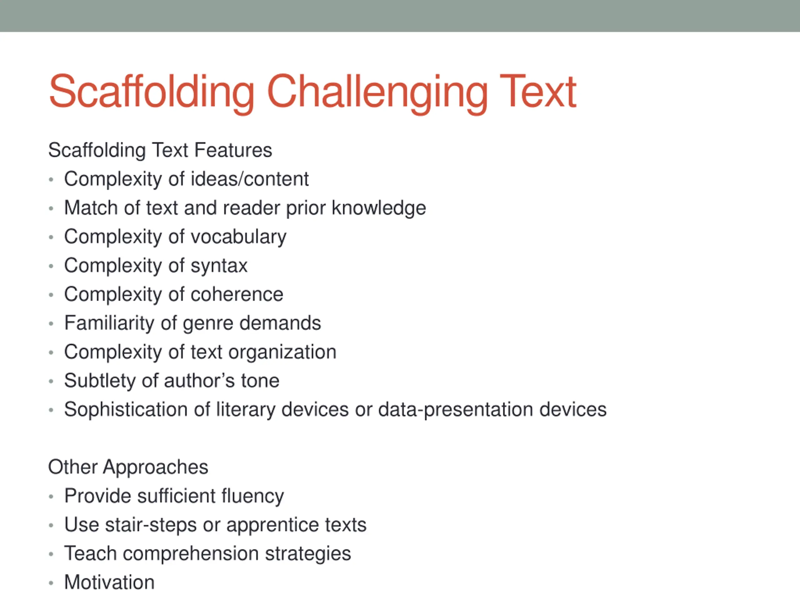 Scaffolding Challenging Text Scaffolding Text Features Complexity of ideas/content Match of text and reader prior knowledge Complexity of vocabulary Complexity of syntax Complexity of coherence Familiarity of genre demands Complexity of text organization Subtlety of author s tone Sophistication of literary devices or data-presentation devices Other Approaches Provide sufficient fluency Use stair-steps or apprentice texts Teach comprehension strategies Motivation