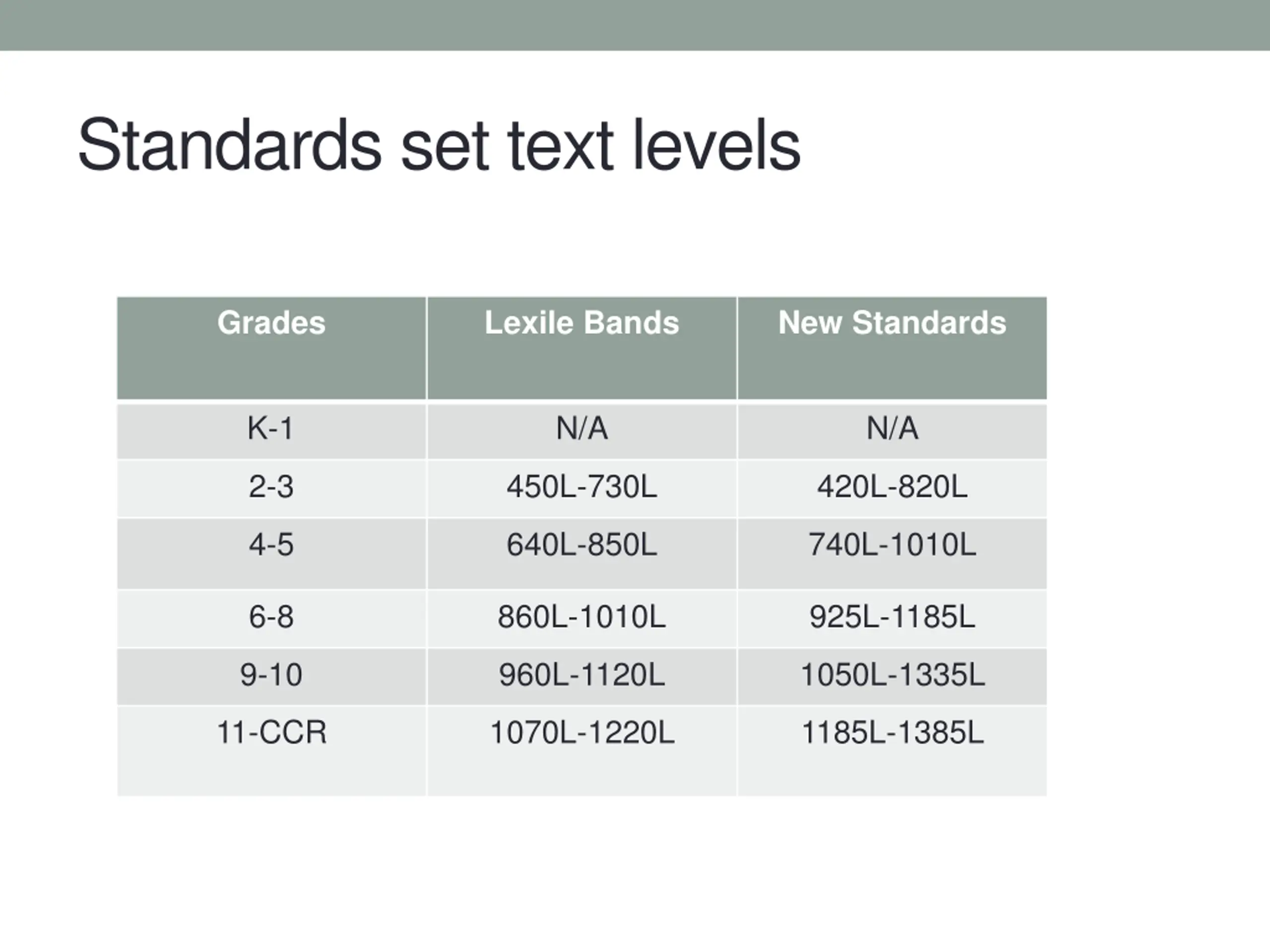 Standards set text levels Grades Lexile Bands New Standards K-1 N/A N/A 2-3 450L-730L 420L-820L 4-5 640L-850L 740L-1010L 6-8 860L-1010L 925L-1185L 9-10 960L-1120L 1050L-1335L 11-CCR 1070L-1220L 1185L-1385L