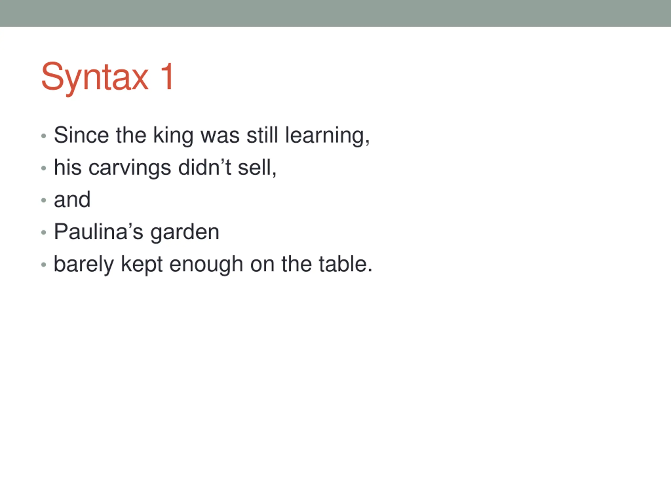 Syntax 1 Since the king was still learning, his carvings didn t sell, and Paulina s garden barely kept enough on the table.