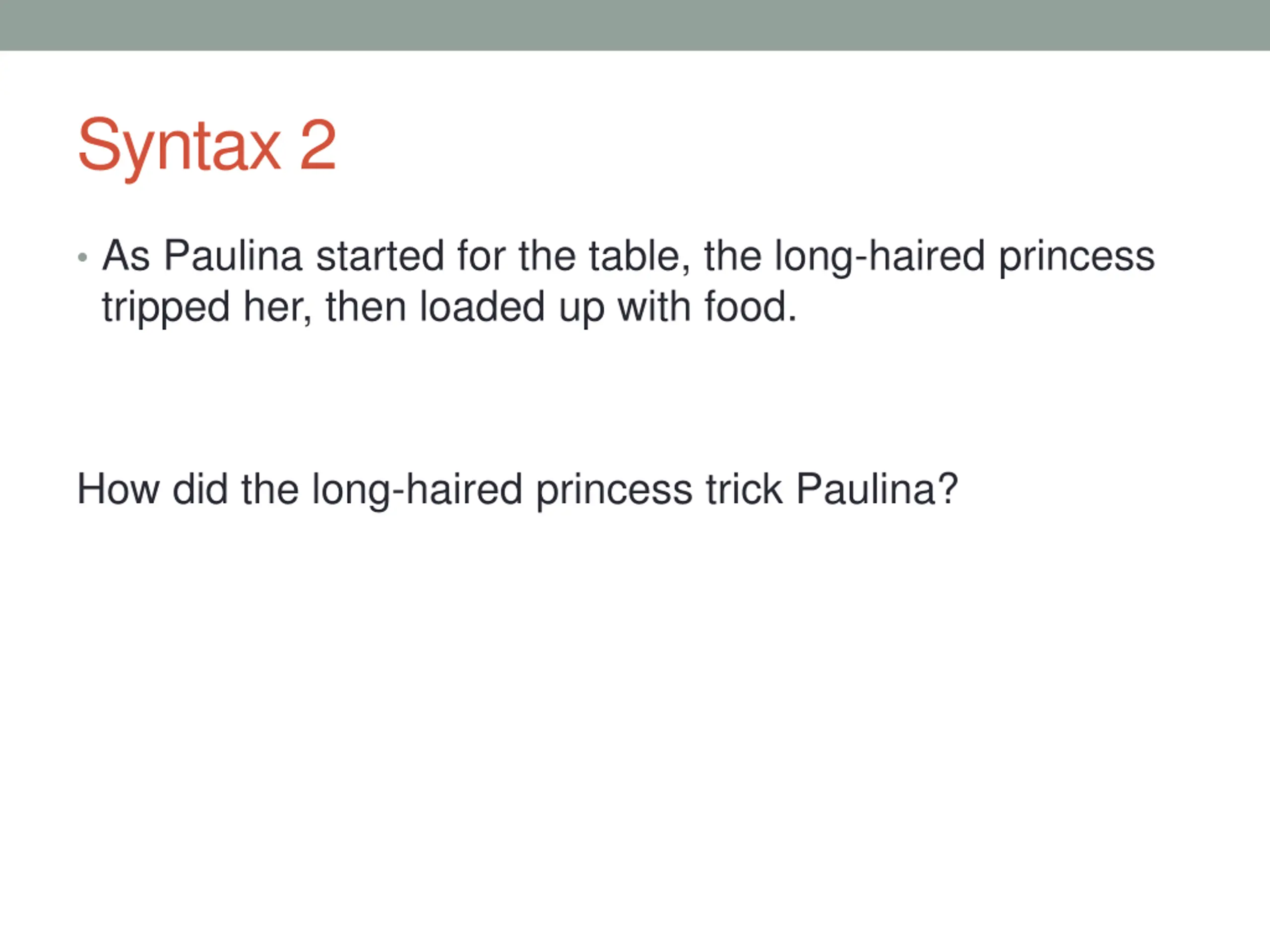 Syntax 2 As Paulina started for the table, the long-haired princess tripped her, then loaded up with food. How did the long-haired princess trick Paulina?