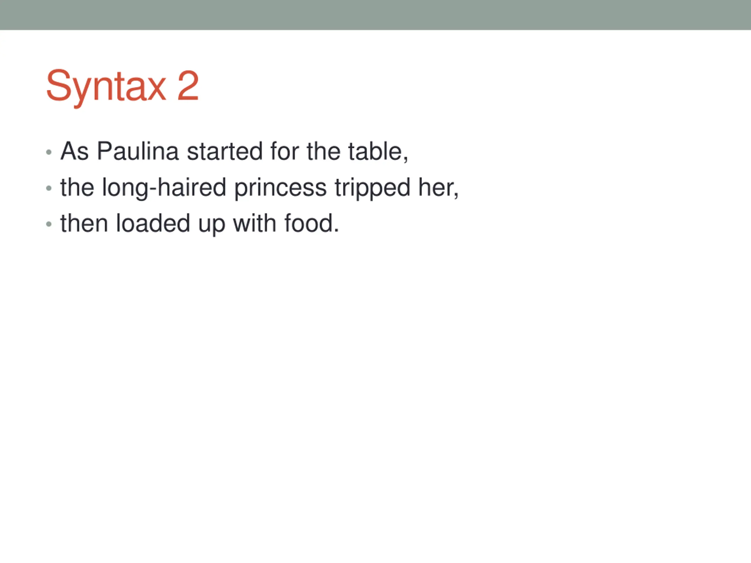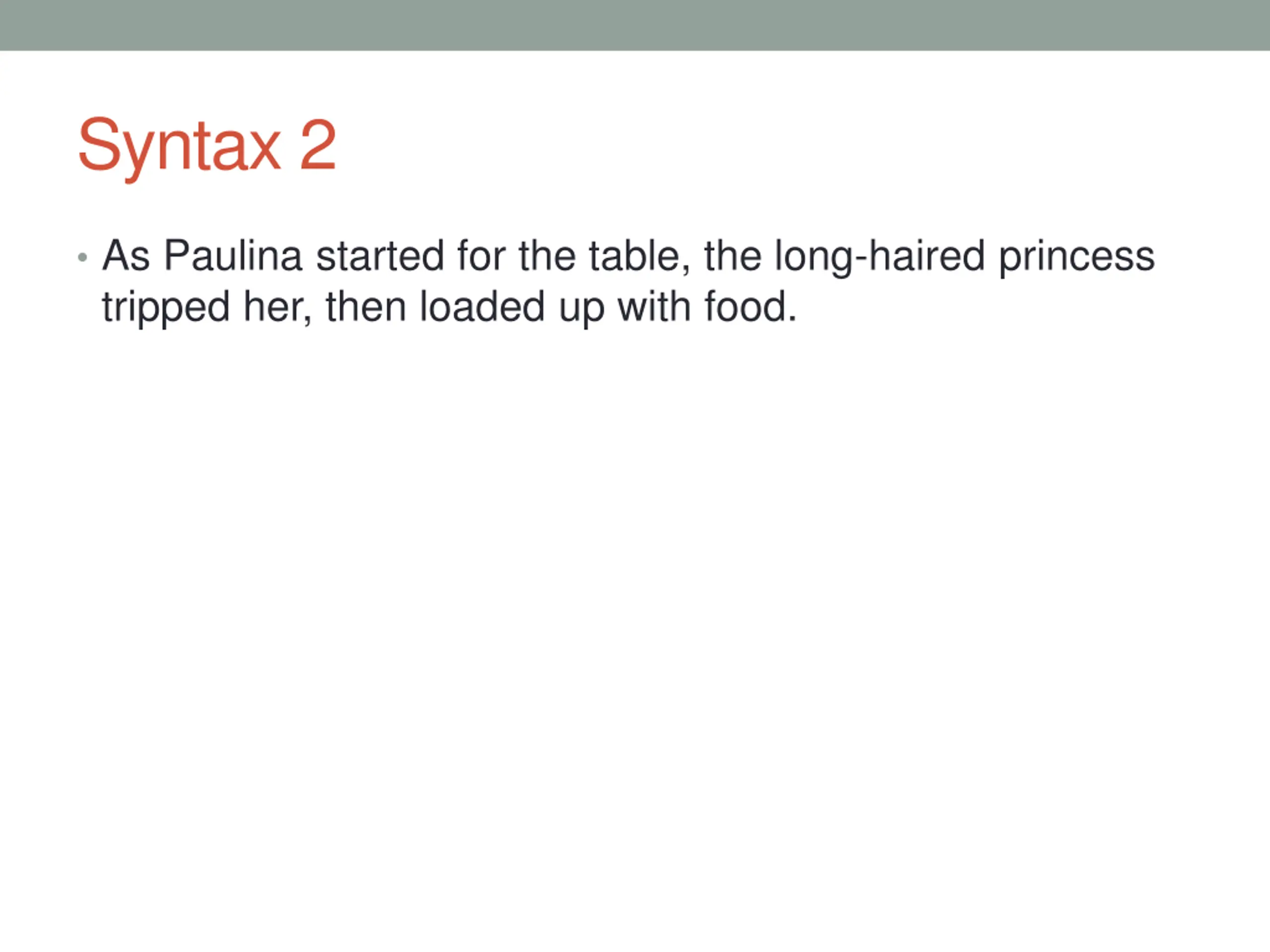 Syntax 2 As Paulina started for the table, the long-haired princess tripped her, then loaded up with food.