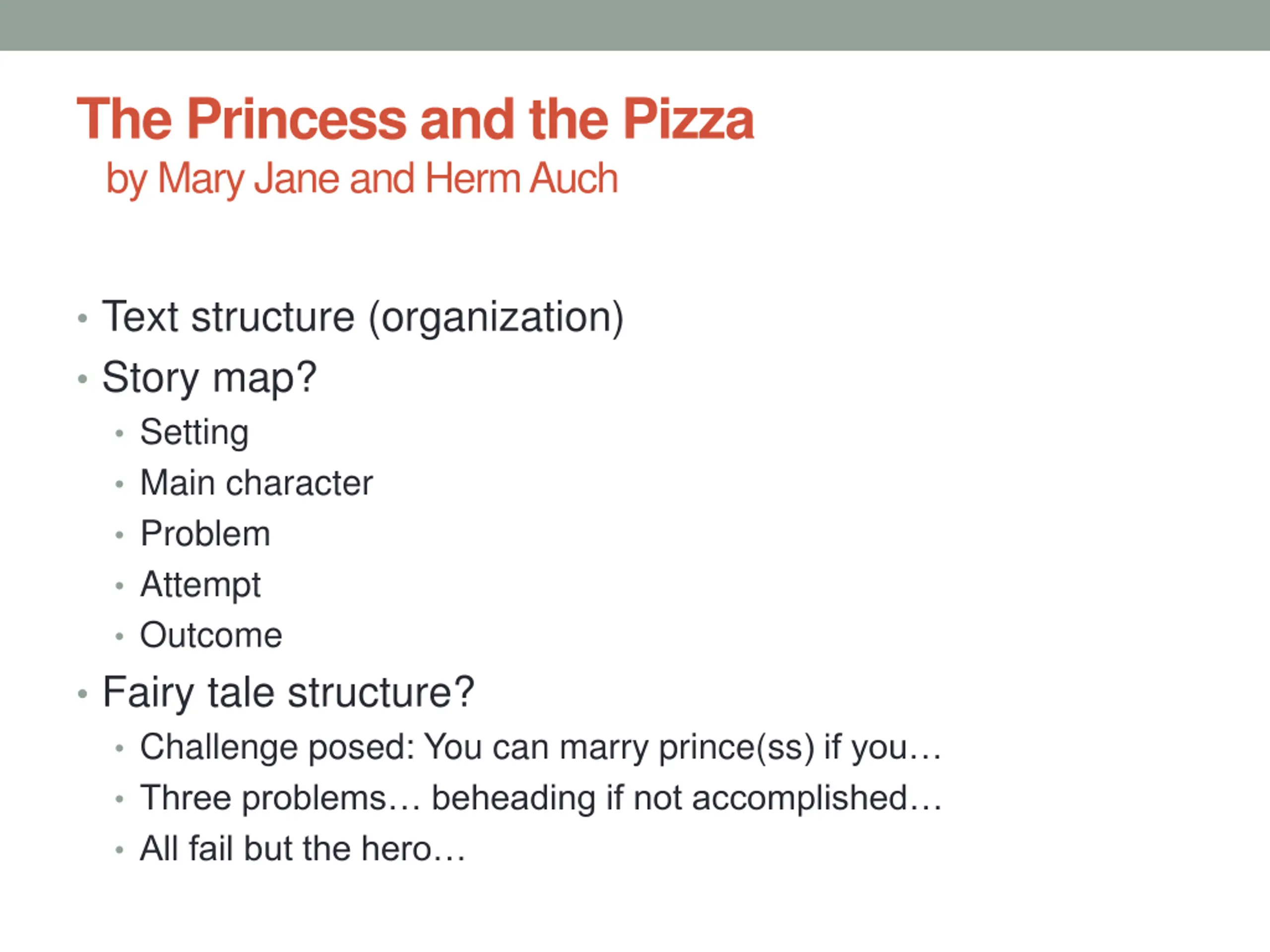 The Princess and the Pizza by Mary Jane and Herm Auch Text structure (organization) Story map? Setting Main character Problem Attempt Outcome Fairy tale structure? Challenge posed: You can marry prince(ss) if you Three problems beheading if not accomplished All fail but the hero