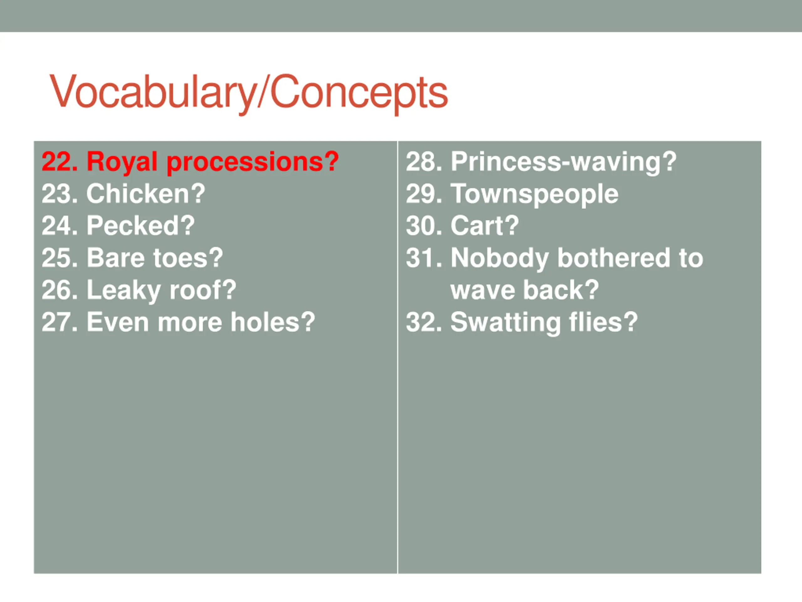 Vocabulary/Concepts 22. Royal processions? 23. Chicken? 24. Pecked? 25. Bare toes? 26. Leaky roof? 27. Even more holes? 28. Princess-waving? 29. Townspeople 30. Cart? 31. Nobody bothered to wave back? 32. Swatting flies?