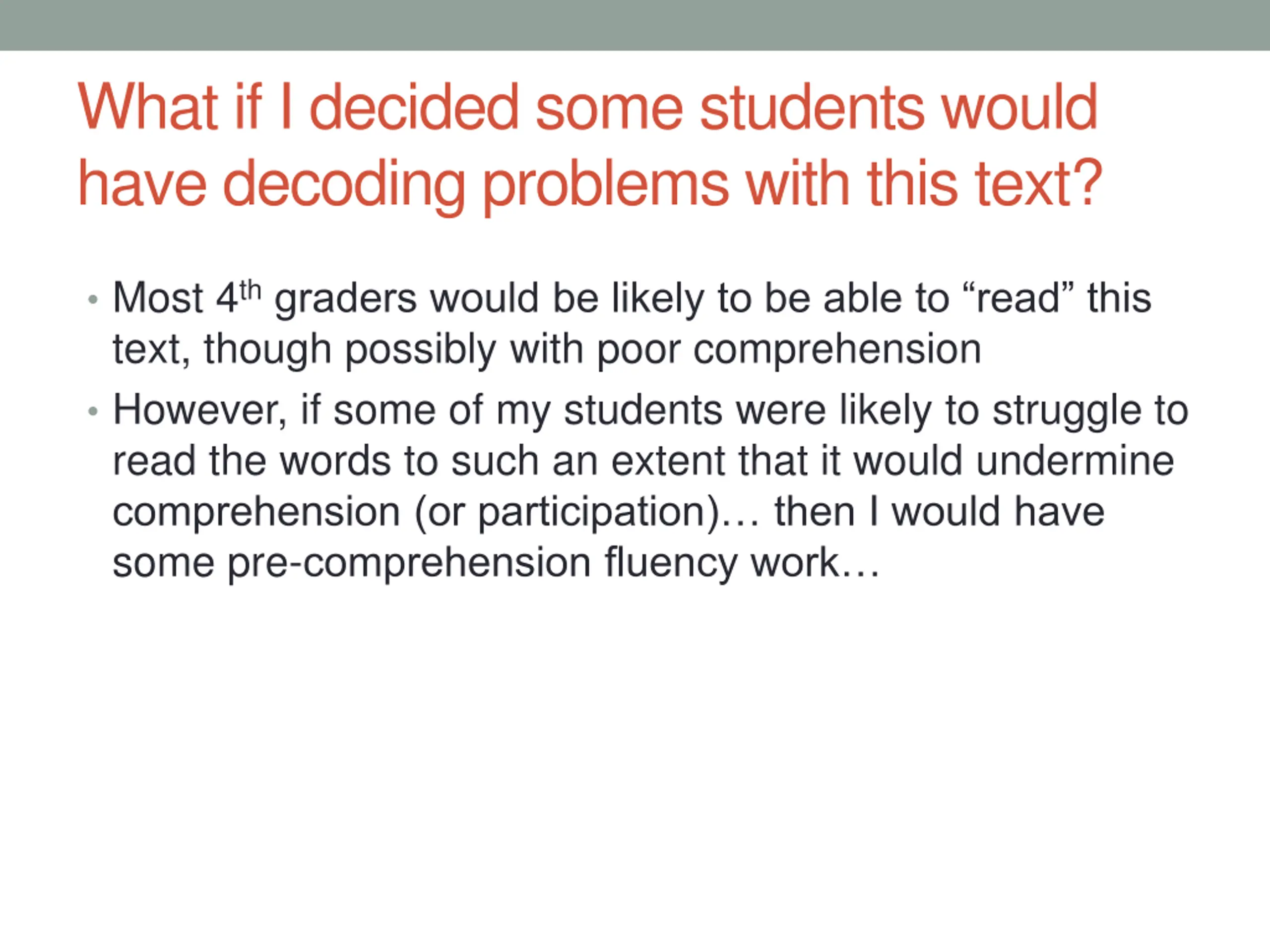 What if I decided some students would have decoding problems with this text? Most 4thgraders would be likely to be able to read this text, though possibly with poor comprehension However, if some of my students were likely to struggle to read the words to such an extent that it would undermine comprehension (or participation) then I would have some pre-comprehension fluency work
