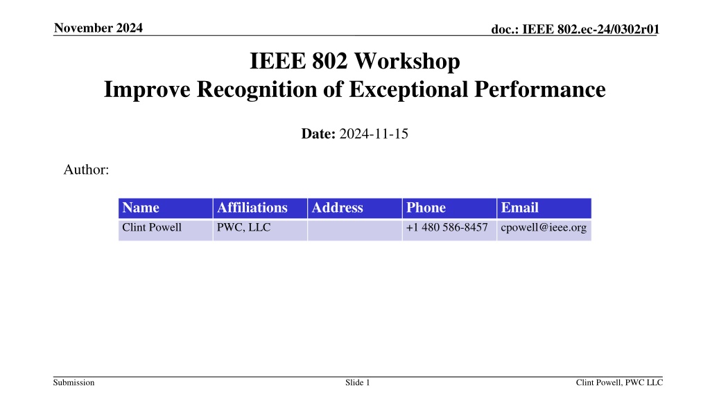 November 2024 doc.: IEEE 802.ec-24/0302r01 IEEE 802 Workshop Improve Recognition of Exceptional Performance Date: 2024-11-15 Author: Name Clint Powell Affiliations PWC, LLC Address Phone +1 480 586-8457 Email cpowell@ieee.org Submission Slide 1 Clint Powell, PWC LLC
