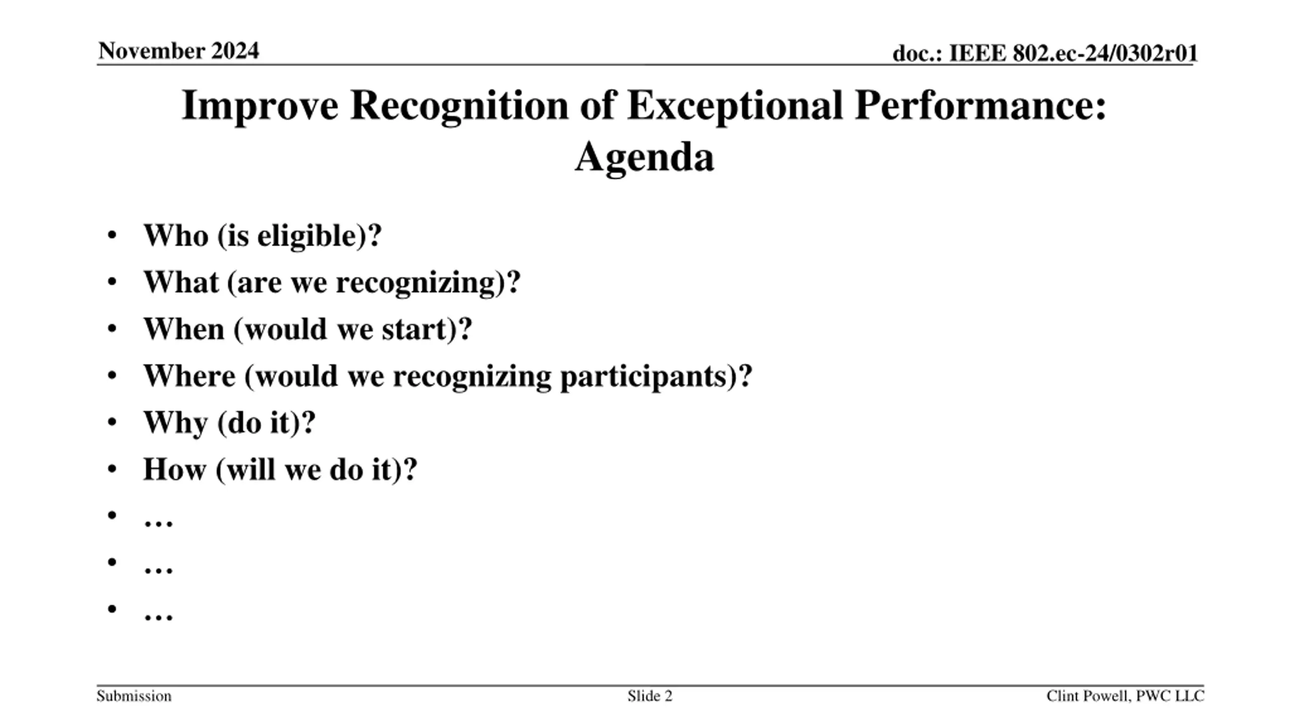 November 2024 doc.: IEEE 802.ec-24/0302r01 Improve Recognition of Exceptional Performance: Agenda Who (is eligible)? What(are we recognizing)? When (would we start)? Where (would we recognizing participants)? Why (do it)? How (will we do it)? Submission Slide 2 Clint Powell, PWC LLC