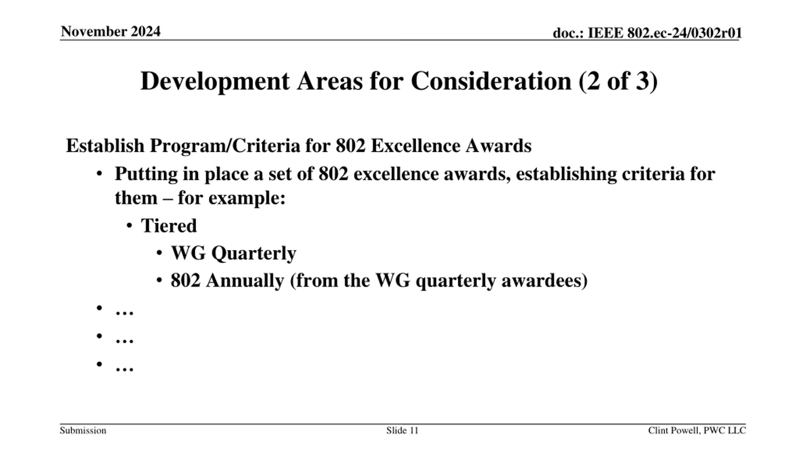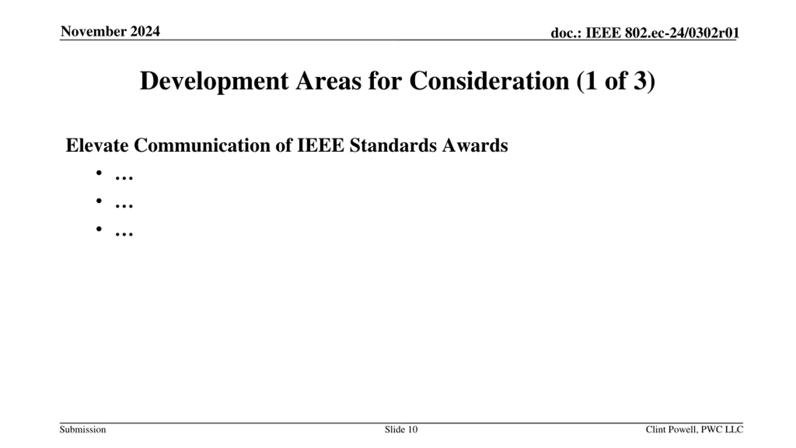 November 2024 doc.: IEEE 802.ec-24/0302r01 Development Areas for Consideration (1 of 3) Elevate Communication of IEEE Standards Awards Submission Slide 10 Clint Powell, PWC LLC