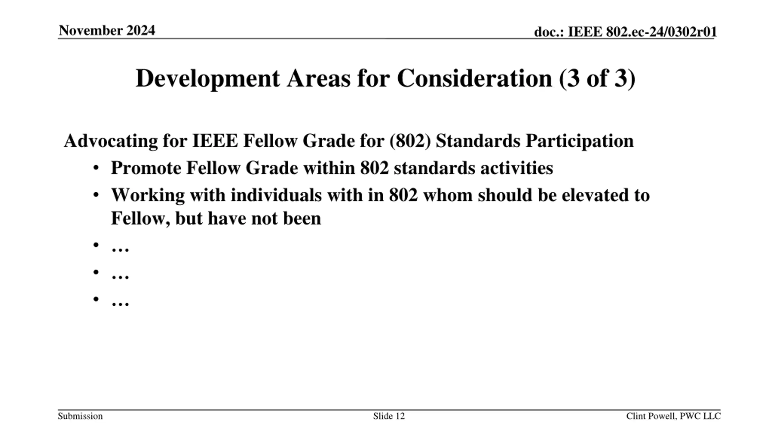 November 2024 doc.: IEEE 802.ec-24/0302r01 Development Areas for Consideration (3 of 3) Advocating for IEEE Fellow Grade for (802) Standards Participation Promote Fellow Grade within 802 standards activities Working with individuals with in 802 whom should be elevated to Fellow, but have not been Submission Slide 12 Clint Powell, PWC LLC