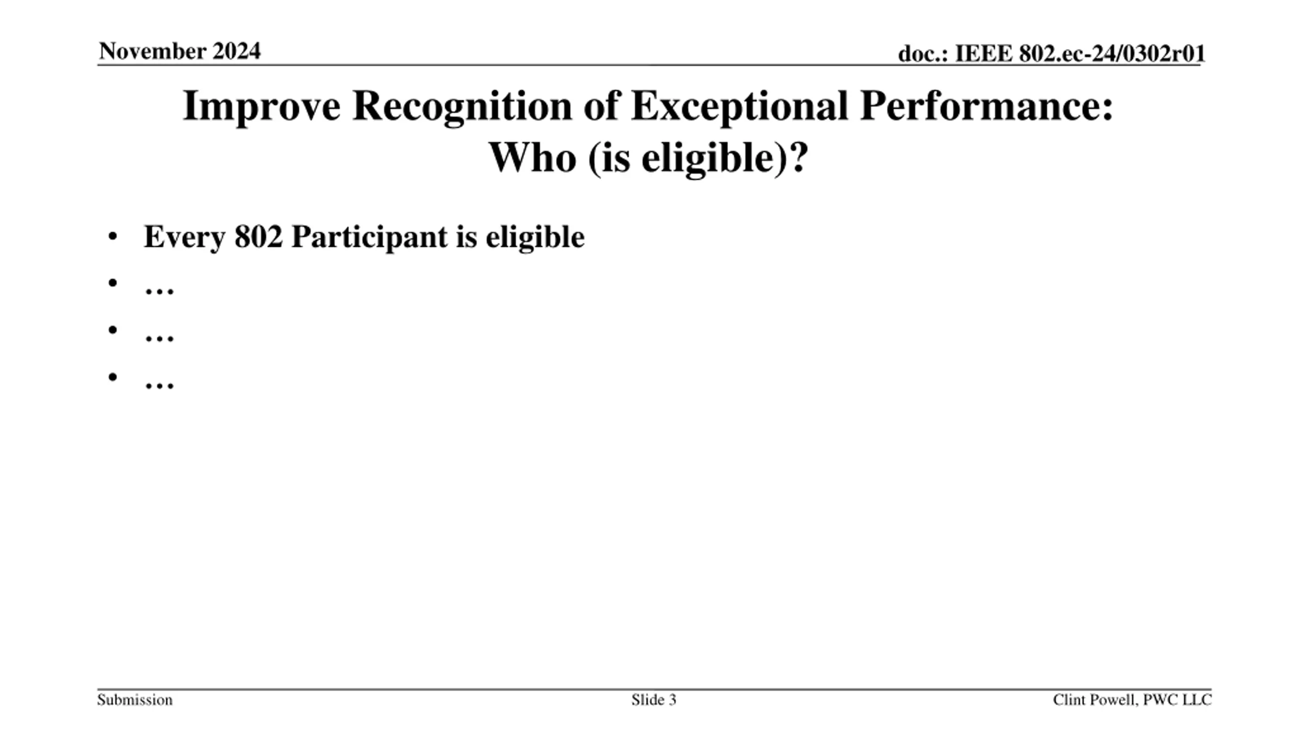 November 2024 doc.: IEEE 802.ec-24/0302r01 Improve Recognition of Exceptional Performance: Who (is eligible)? Every 802 Participant is eligible Submission Slide 3 Clint Powell, PWC LLC