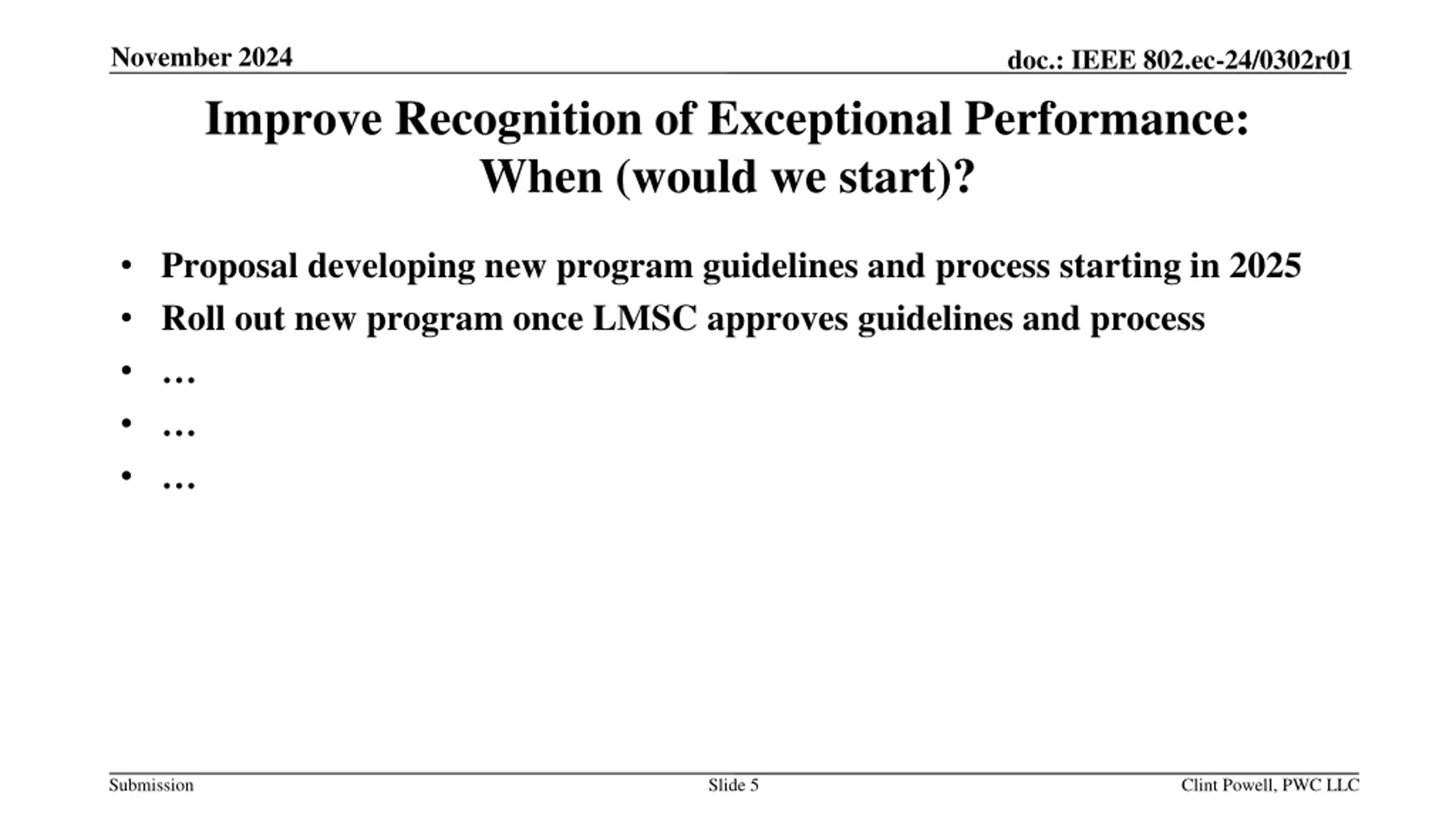 November 2024 doc.: IEEE 802.ec-24/0302r01 Improve Recognition of Exceptional Performance: When (would we start)? Proposal developing new program guidelines and process starting in 2025 Roll out new program once LMSC approves guidelines and process Submission Slide 5 Clint Powell, PWC LLC