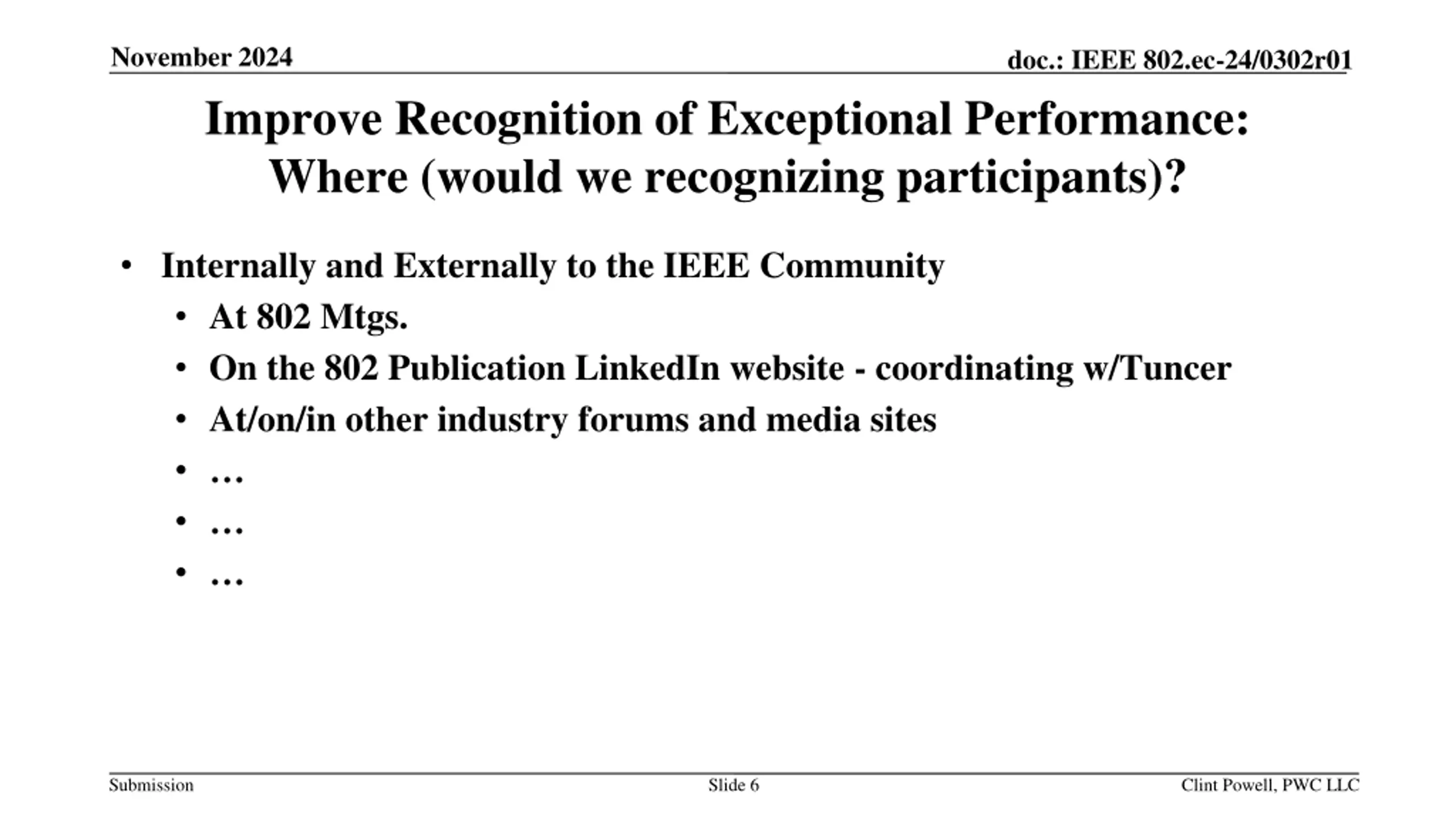 November 2024 doc.: IEEE 802.ec-24/0302r01 Improve Recognition of Exceptional Performance: Where (would we recognizing participants)? Internally and Externally to the IEEE Community At 802 Mtgs. On the 802 Publication LinkedIn website - coordinating w/Tuncer At/on/in other industry forums and media sites Submission Slide 6 Clint Powell, PWC LLC
