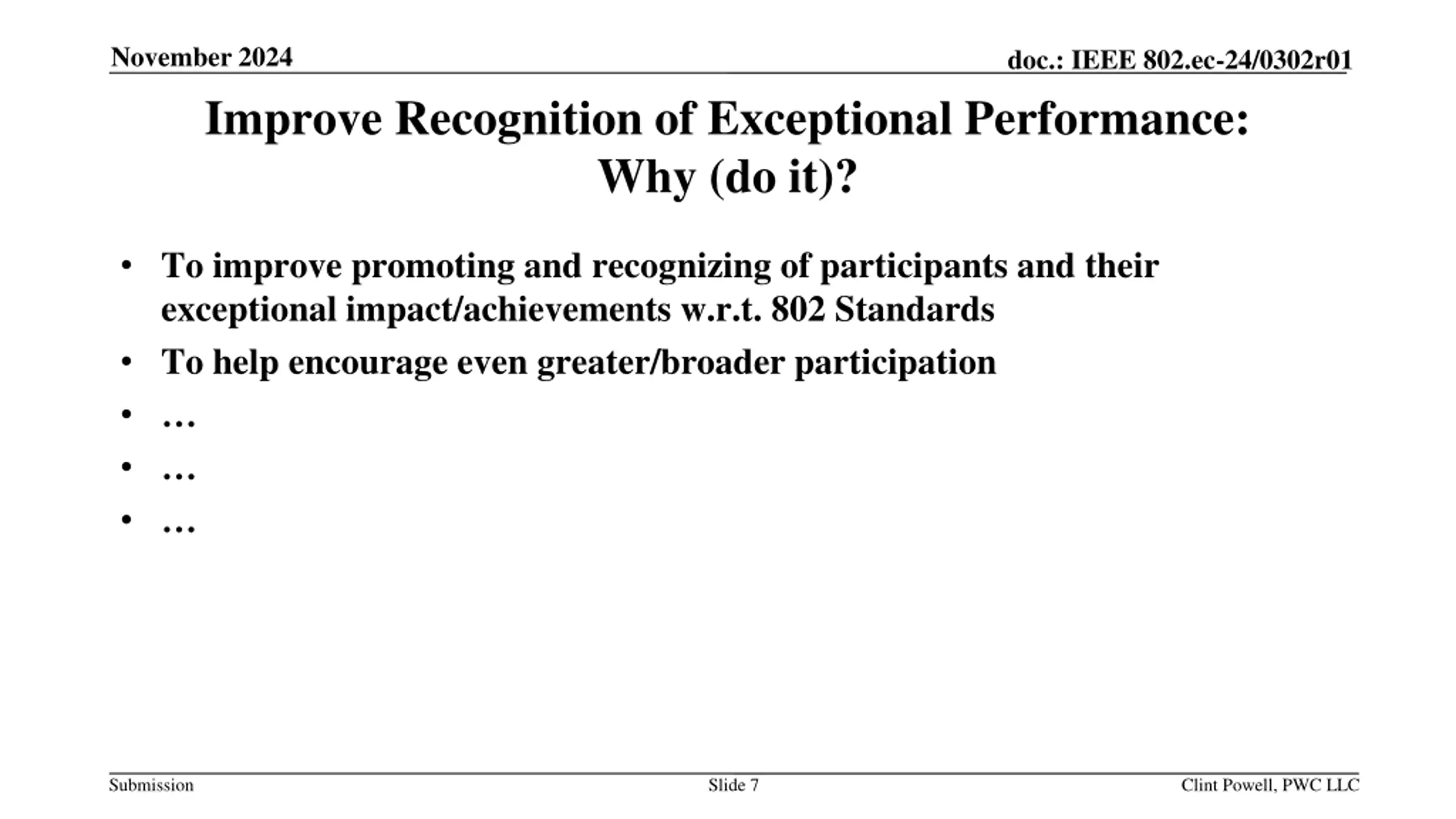 November 2024 doc.: IEEE 802.ec-24/0302r01 Improve Recognition of Exceptional Performance: Why (do it)? To improve promoting and recognizing of participants and their exceptional impact/achievements w.r.t. 802 Standards To help encourage even greater/broader participation Submission Slide 7 Clint Powell, PWC LLC