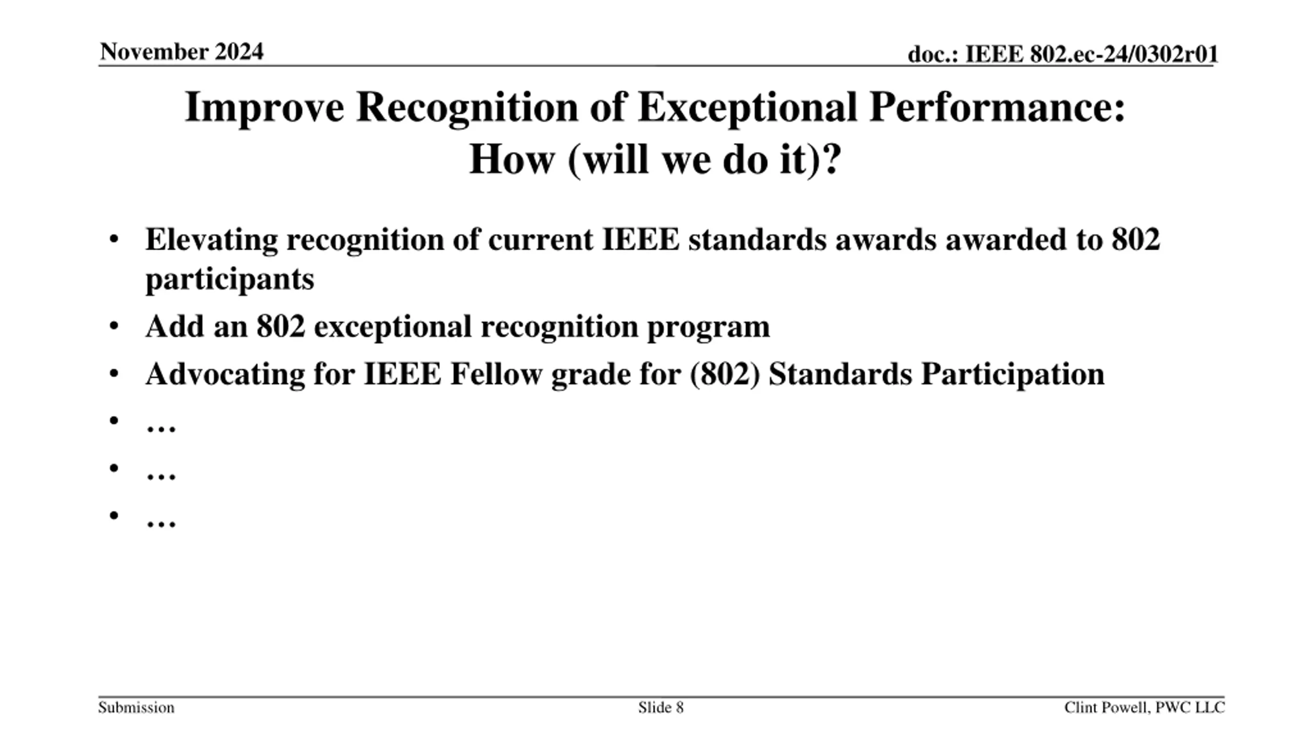 November 2024 doc.: IEEE 802.ec-24/0302r01 Improve Recognition of Exceptional Performance: How (will we do it)? Elevating recognition of current IEEE standards awards awarded to 802 participants Add an 802 exceptional recognition program Advocating for IEEE Fellow grade for (802) Standards Participation Submission Slide 8 Clint Powell, PWC LLC