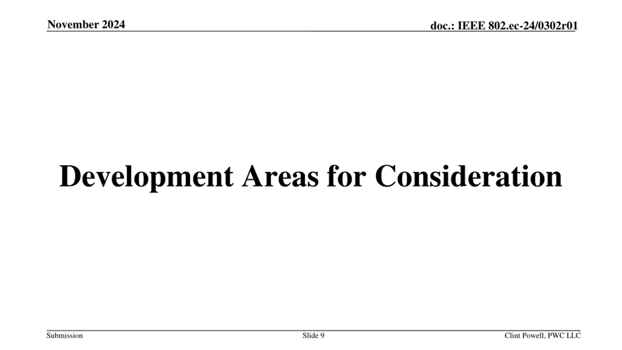 November 2024 doc.: IEEE 802.ec-24/0302r01 Development Areas for Consideration Submission Slide 9 Clint Powell, PWC LLC