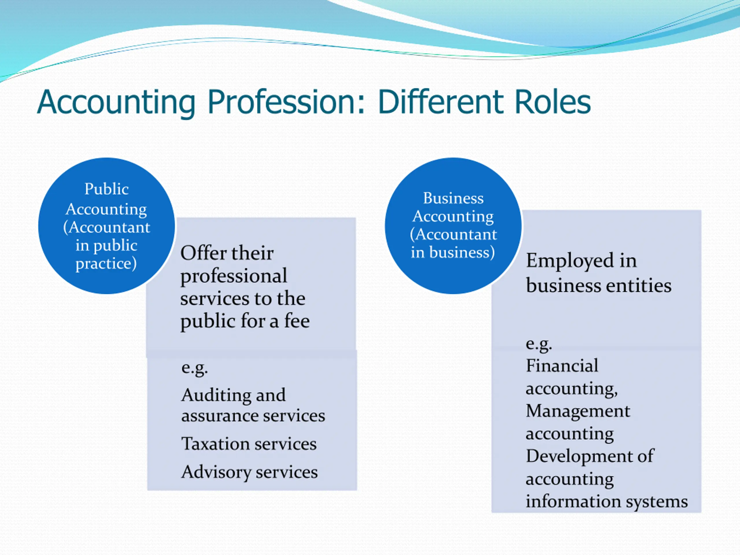 Accounting Profession: Different Roles Public Accounting (Accountant in public practice) Business Accounting (Accountant in business) Offer their professional services to the public for a fee Employed in business entities e.g. Financial accounting, Management accounting Development of accounting information systems e.g. Auditing and assurance services Taxation services Advisory services
