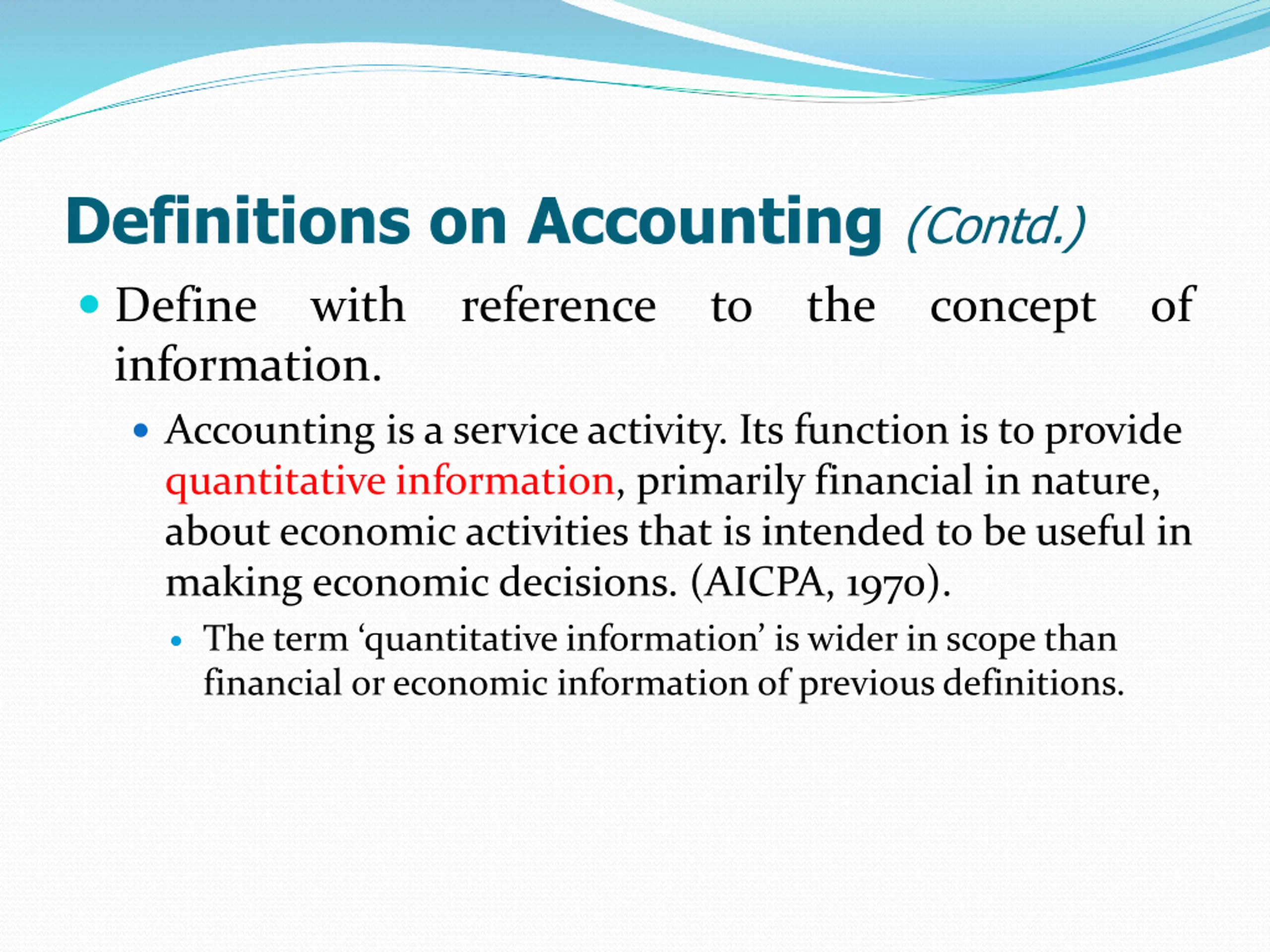 Definitions on Accounting (Contd.) Define information. with reference to the concept of Accounting is a service activity. Its function is to provide quantitative information, primarily financial in nature, about economic activities that is intended to be useful in making economic decisions. (AICPA, 1970). The term quantitative information is wider in scope than financial or economic information of previous definitions.