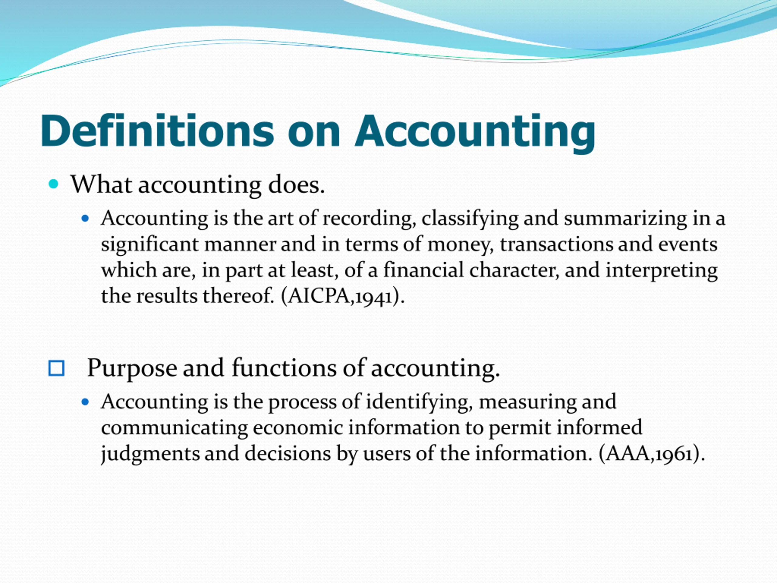 Definitions on Accounting What accounting does. Accounting is the art of recording, classifying and summarizing in a significant manner and in terms of money, transactions and events which are, in part at least, of a financial character, and interpreting the results thereof. (AICPA,1941). Purpose and functions of accounting. Accounting is the process of identifying, measuring and communicating economic information to permit informed judgments and decisions by users of the information. (AAA,1961).