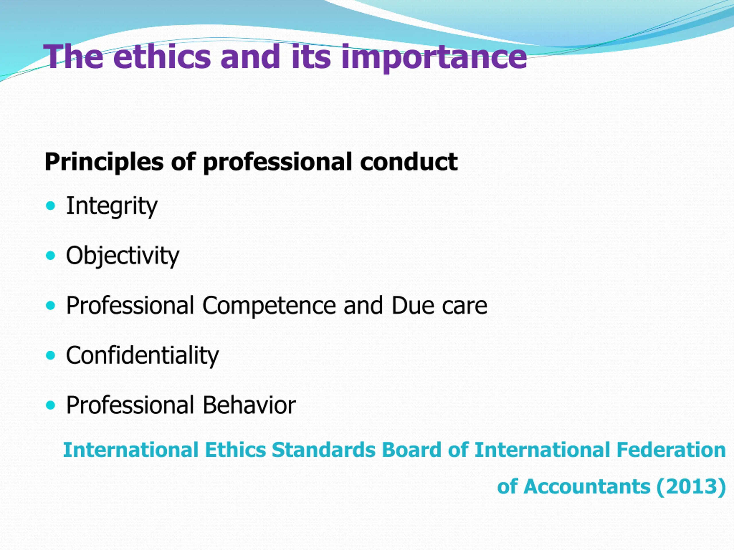 The ethics and its importance Principles of professional conduct Integrity Objectivity Professional Competence and Due care Confidentiality Professional Behavior International Ethics Standards Board of International Federation of Accountants (2013)