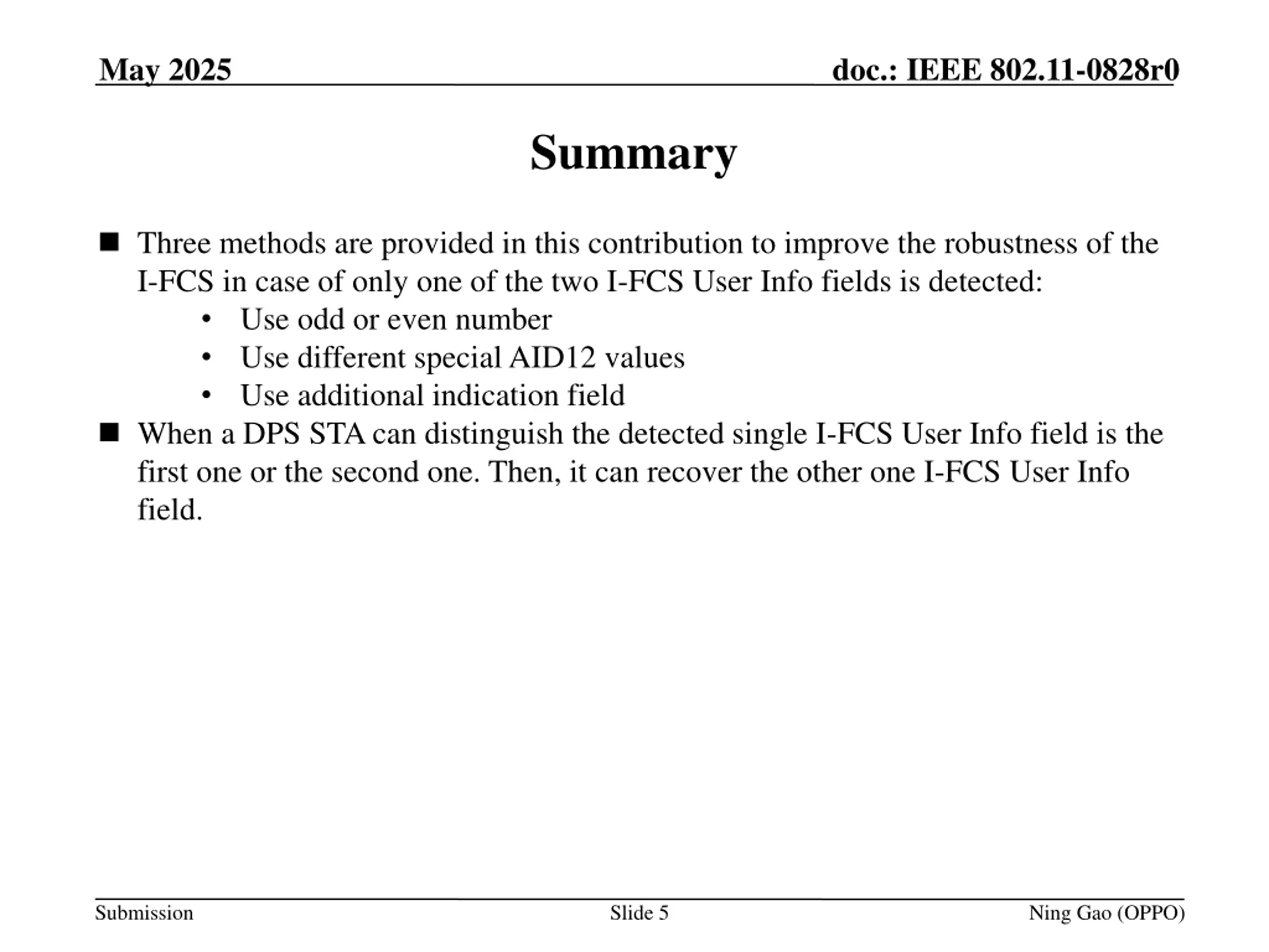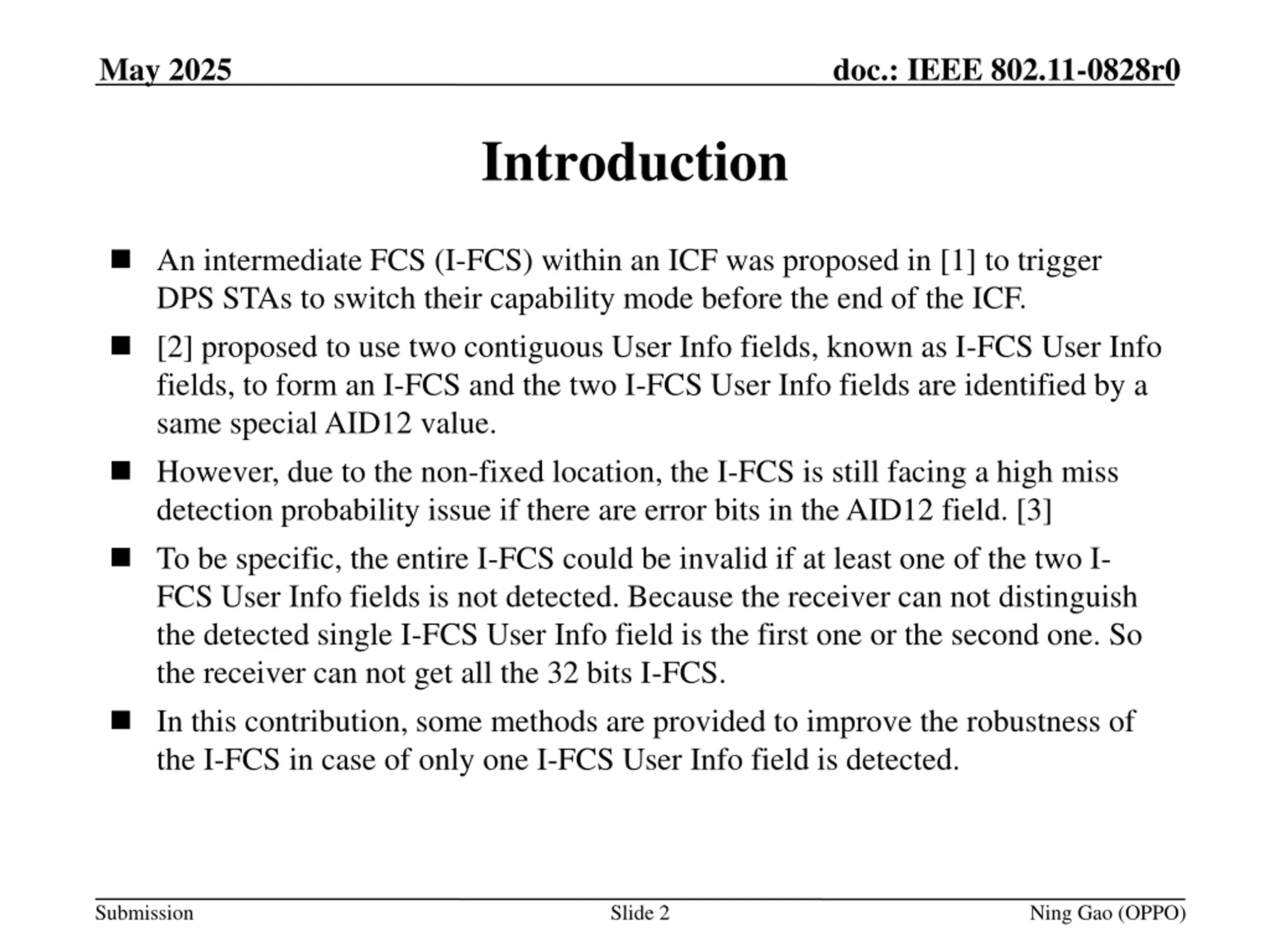 May 2025 doc.: IEEE 802.11-0828r0 Introduction An intermediate FCS (I-FCS) within an ICF was proposed in [1] to trigger DPS STAs to switch their capability mode before the end of the ICF. [2] proposed to use two contiguous User Info fields, known as I-FCS User Info fields, to form an I-FCS and the two I-FCS User Info fields are identified by a same special AID12 value. However, due to the non-fixed location, the I-FCS is still facing a high miss detection probability issue if there are error bits in the AID12 field. [3] To be specific, the entire I-FCS could be invalid if at least one of the two I- FCS User Info fields is not detected. Because the receiver can not distinguish the detected single I-FCS User Info field is the first one or the second one. So the receiver can not get all the 32 bits I-FCS. In this contribution, some methods are provided to improve the robustness of the I-FCS in case of only one I-FCS User Info field is detected. Submission Slide 2 Ning Gao (OPPO)