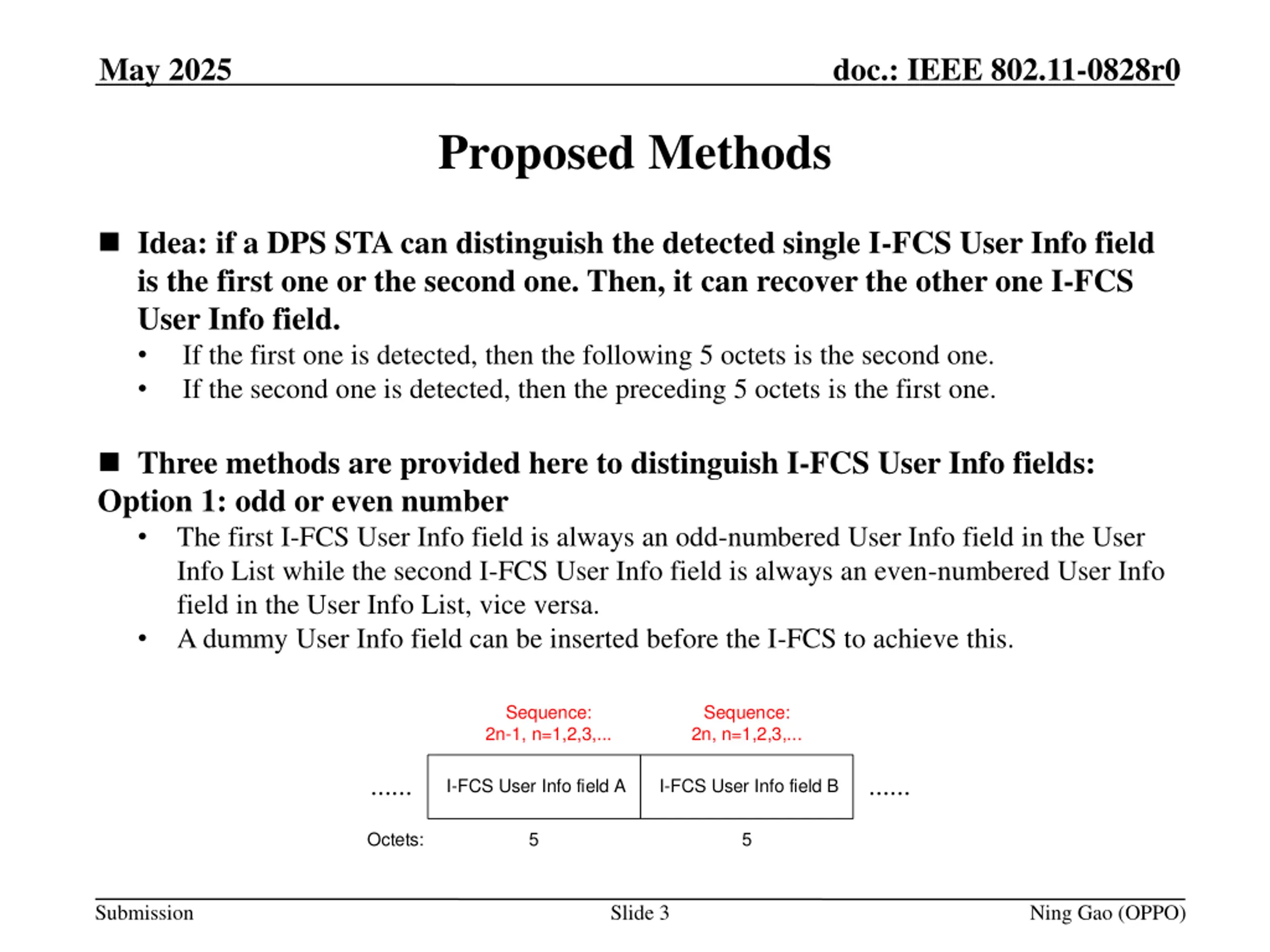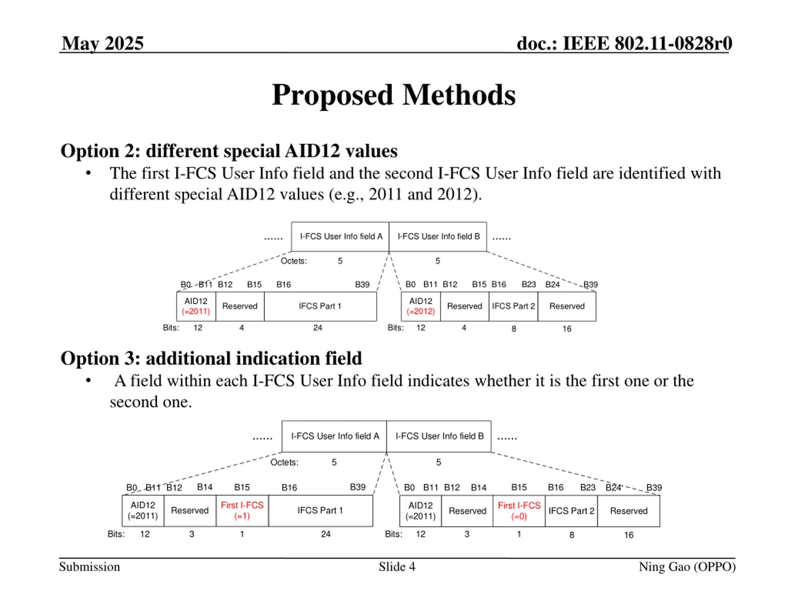 May 2025 doc.: IEEE 802.11-0828r0 Proposed Methods Idea: if a DPS STA can distinguish the detected single I-FCS User Info field is the first one or the second one. Then, it can recover the other one I-FCS User Info field. If the first one is detected, then the following 5 octets is the second one. If the second one is detected, then the preceding 5 octets is the first one. Three methods are provided here to distinguish I-FCS User Info fields: Option 1: odd or even number The first I-FCS User Info field is always an odd-numbered User Info field in the User Info List while the second I-FCS User Info field is always an even-numbered User Info field in the User Info List, vice versa. A dummy User Info field can be inserted before the I-FCS to achieve this. Sequence: 2n-1, n=1,2,3,... Sequence: 2n, n=1,2,3,... I-FCS User Info field A I-FCS User Info field B Octets: 5 5 Submission Slide 3 Ning Gao (OPPO)