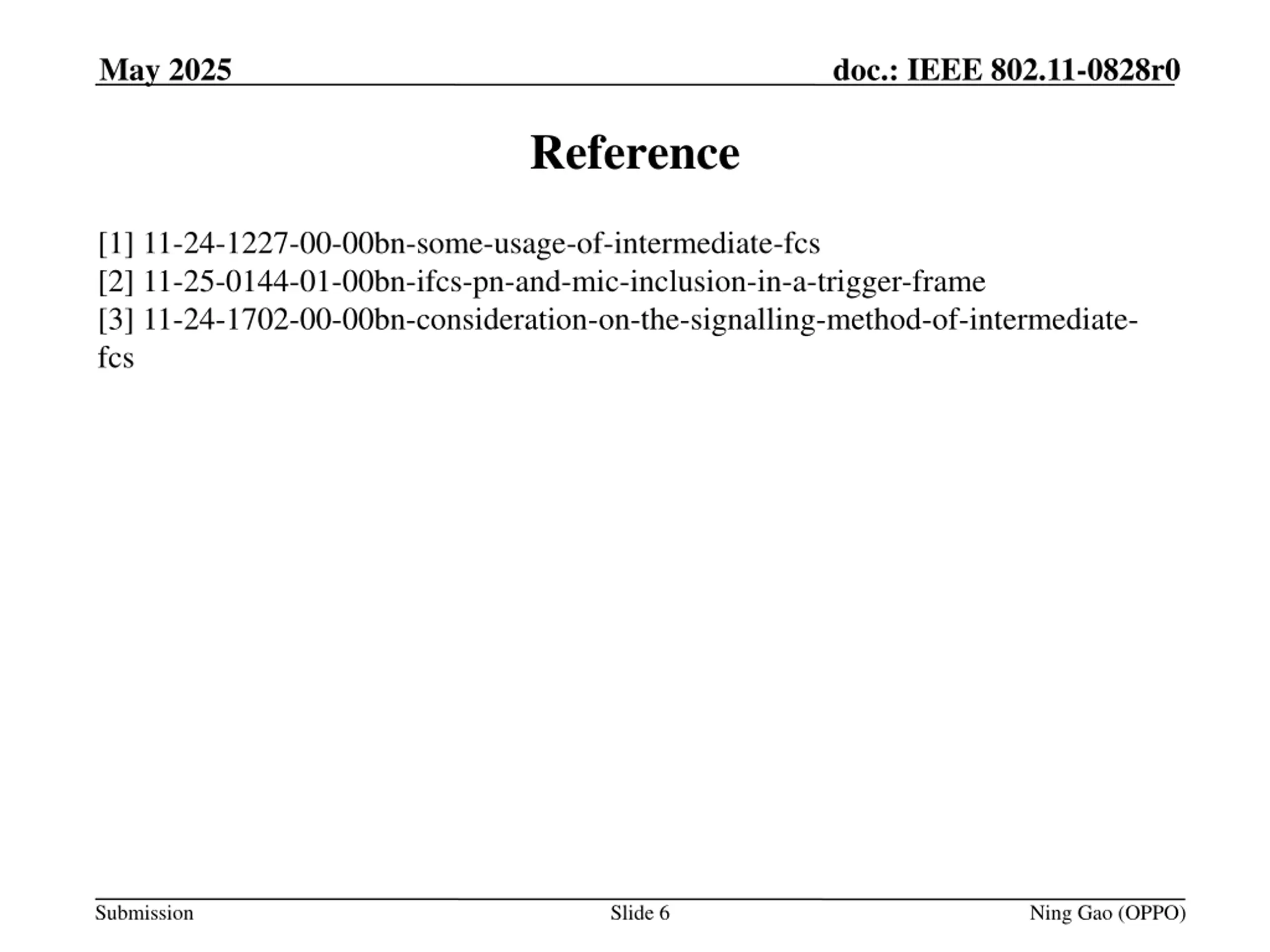 May 2025 doc.: IEEE 802.11-0828r0 Reference [1] 11-24-1227-00-00bn-some-usage-of-intermediate-fcs [2] 11-25-0144-01-00bn-ifcs-pn-and-mic-inclusion-in-a-trigger-frame [3] 11-24-1702-00-00bn-consideration-on-the-signalling-method-of-intermediate- fcs Submission Slide 6 Ning Gao (OPPO)