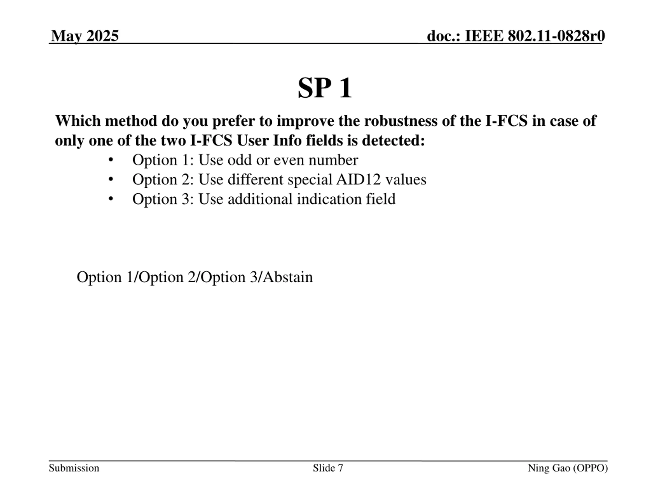 May 2025 doc.: IEEE 802.11-0828r0 SP 1 Which method do you prefer to improve the robustness of the I-FCS in case of only one of the two I-FCS User Info fields is detected: Option 1: Use odd or even number Option 2: Use different special AID12 values Option 3: Use additional indication field Option 1/Option 2/Option 3/Abstain Submission Slide 7 Ning Gao (OPPO)