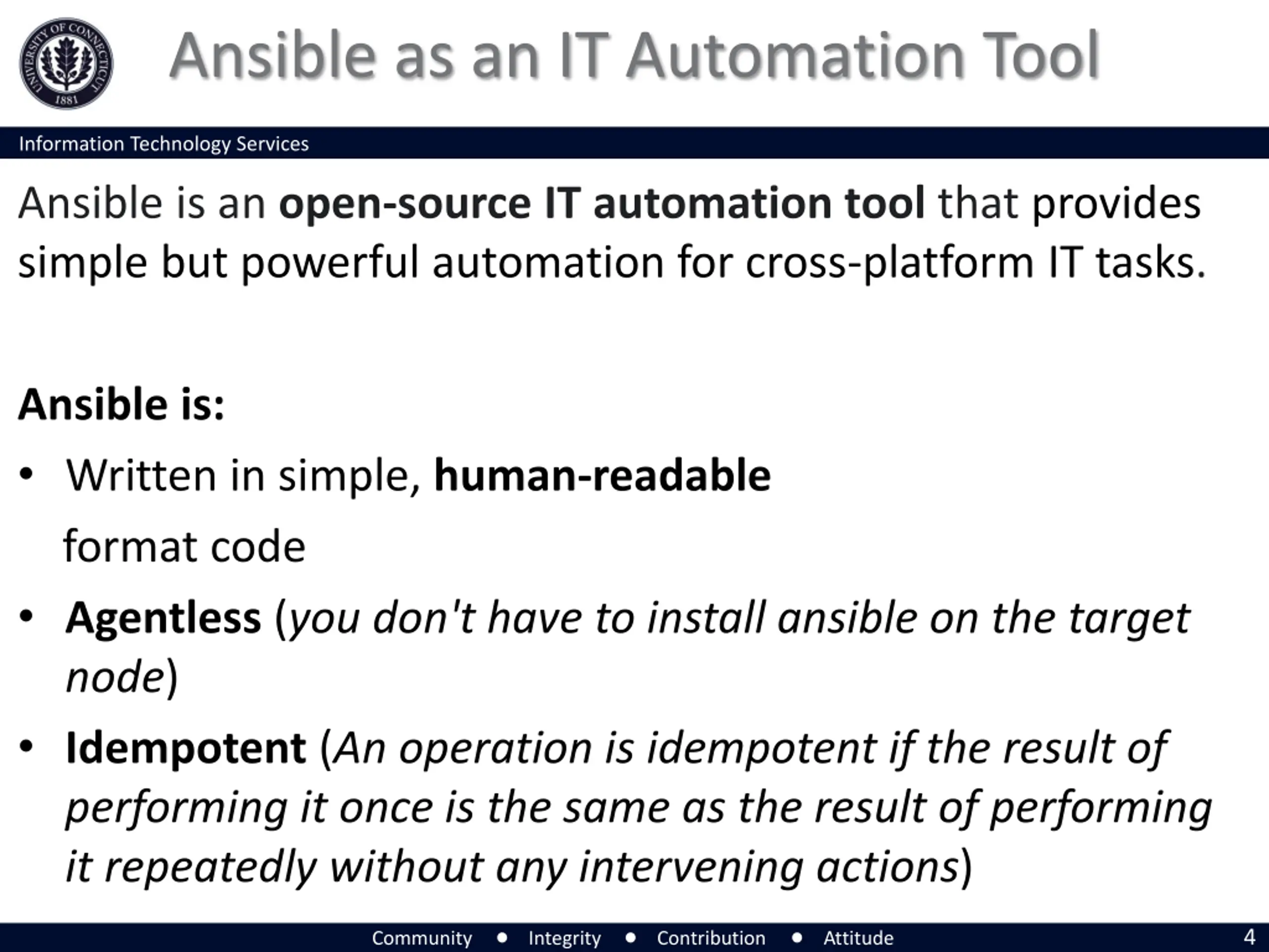Ansible as an IT Automation Tool Information Technology Services Ansible is an open-source IT automation tool that provides simple but powerful automation for cross-platform IT tasks. Ansible is: Written in simple, human-readable format code Agentless (you don't have to install ansible on the target node) Idempotent (An operation is idempotent if the result of performing it once is the same as the result of performing it repeatedly without any intervening actions) 4 Community Integrity Contribution Attitude