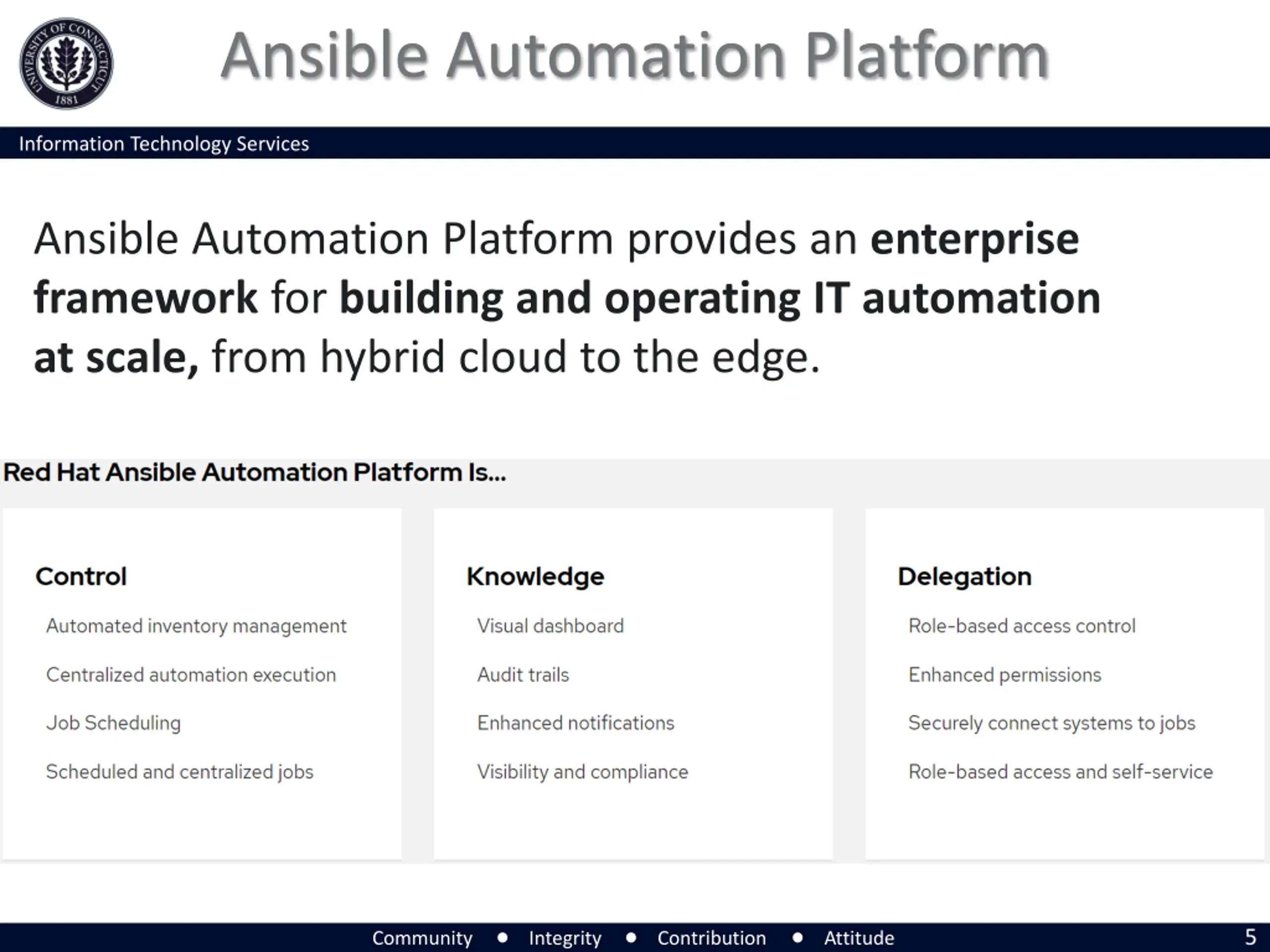 Ansible Automation Platform Information Technology Services Ansible Automation Platform provides an enterprise framework for building and operating IT automation at scale, from hybrid cloud to the edge. 5 Community Integrity Contribution Attitude