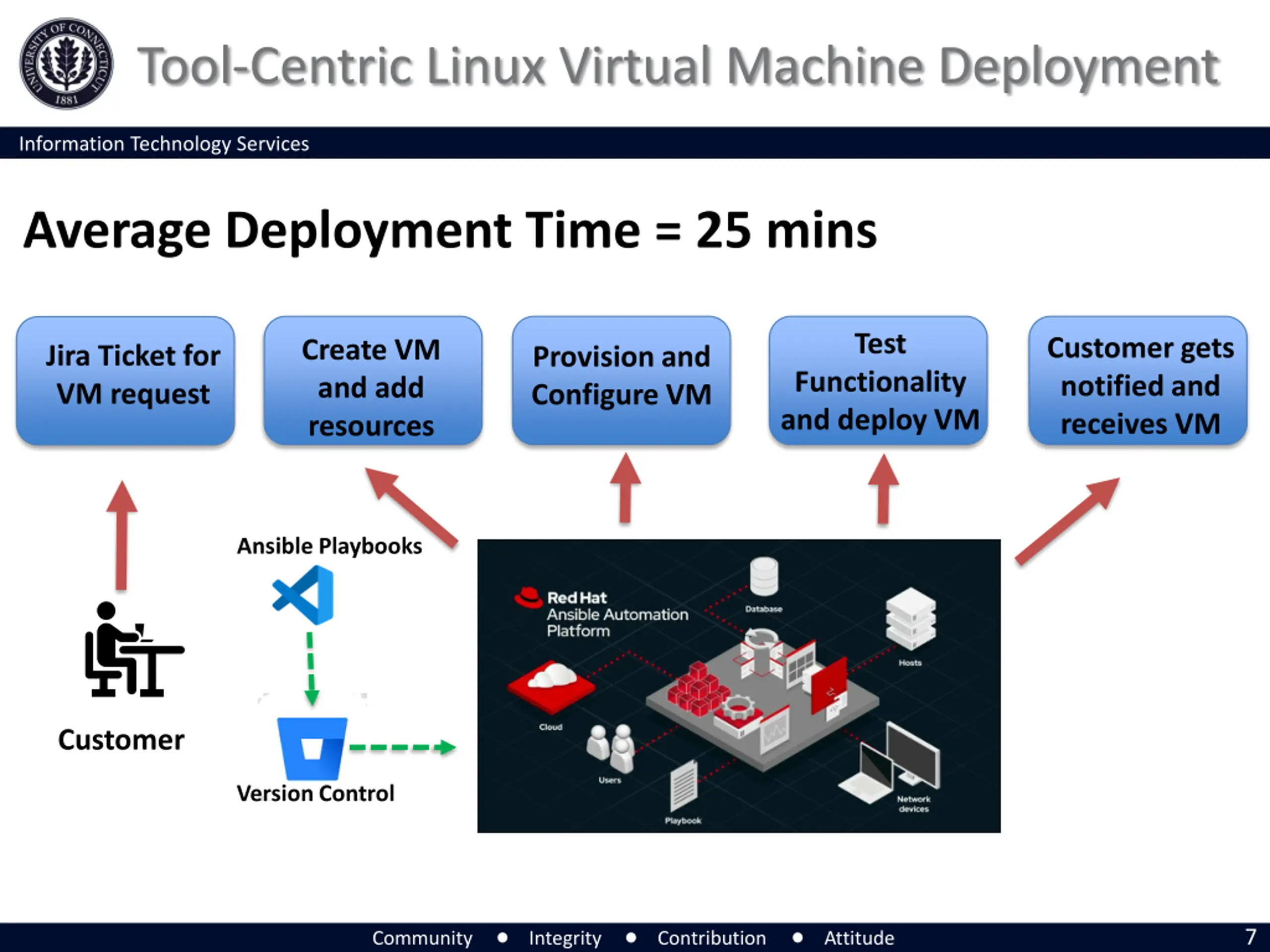 Tool-Centric Linux Virtual Machine Deployment Information Technology Services Average Deployment Time = 25 mins Test Customer gets notified and receives VM Create VM and add resources Jira Ticket for VM request Provision and Configure VM Functionality and deploy VM Ansible Playbooks Customer Version Control 7 Community Integrity Contribution Attitude