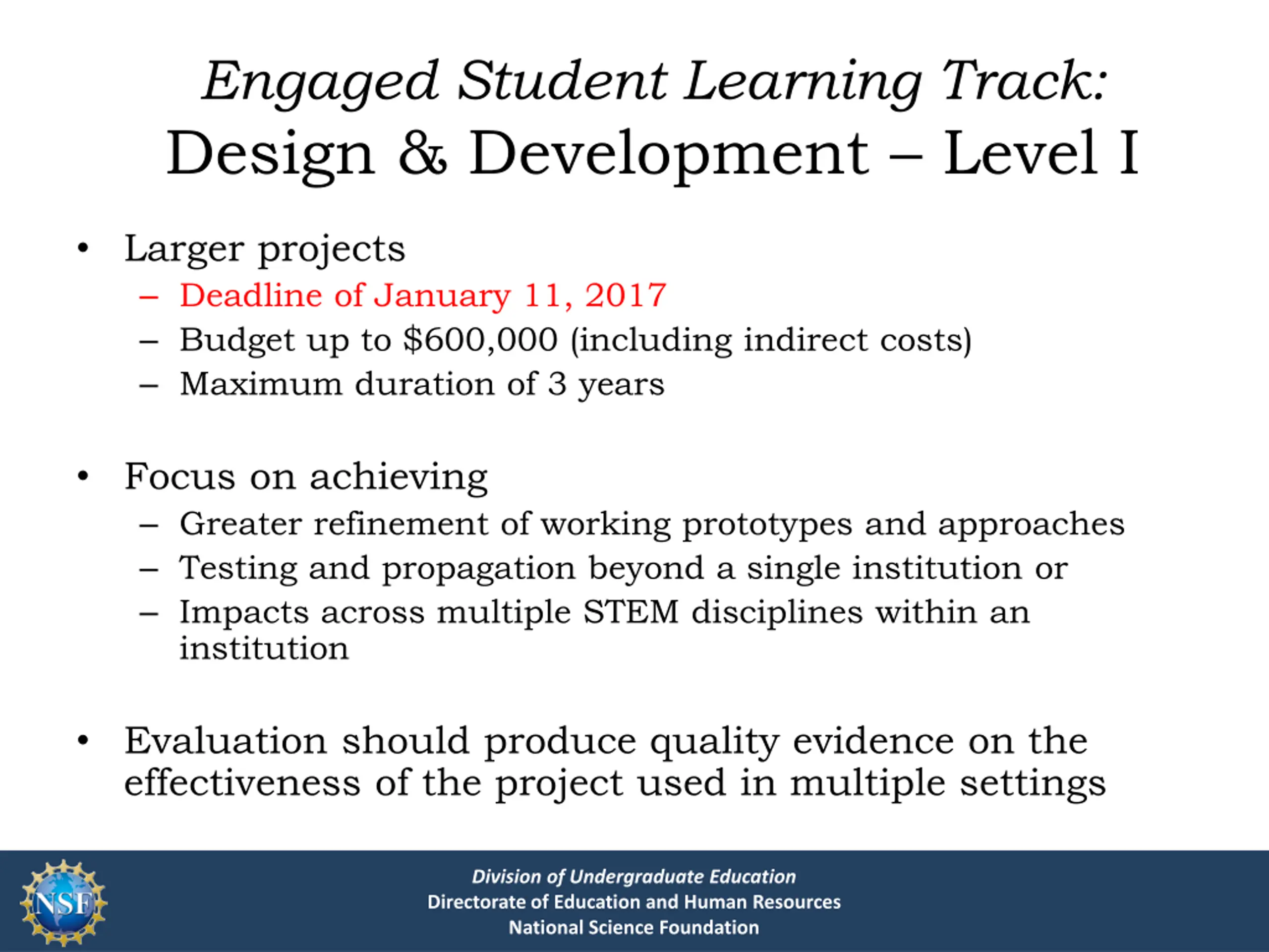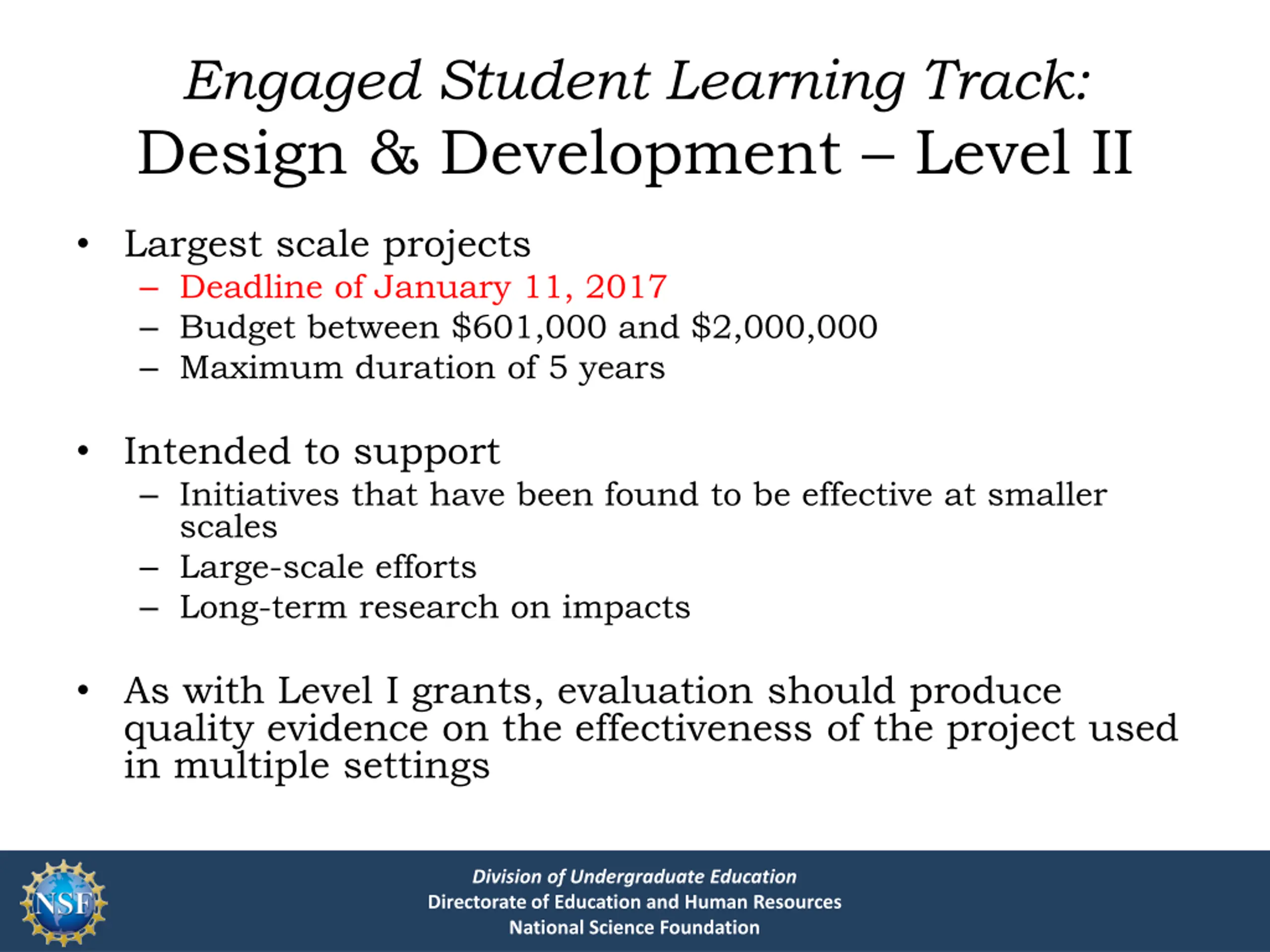 Engaged Student Learning Track: Design & Development Level II Largest scale projects Deadline of January 11, 2017 Budget between $601,000 and $2,000,000 Maximum duration of 5 years Intended to support Initiatives that have been found to be effective at smaller scales Large-scale efforts Long-term research on impacts As with Level I grants, evaluation should produce quality evidence on the effectiveness of the project used in multiple settings Division of Undergraduate Education Directorate of Education and Human Resources National Science Foundation