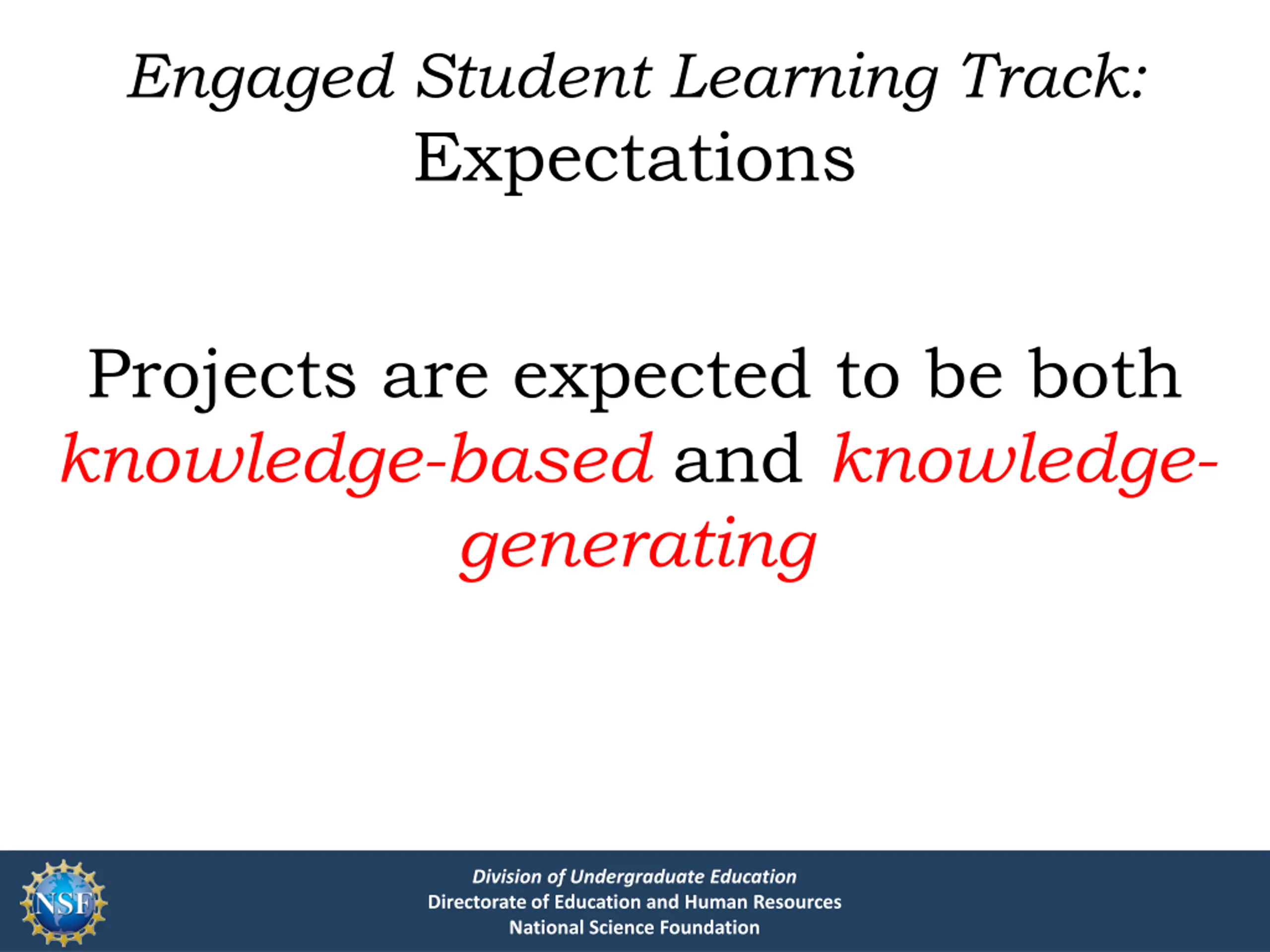 Engaged Student Learning Track: Expectations Projects are expected to be both knowledge-based and knowledge- generating Division of Undergraduate Education Directorate of Education and Human Resources National Science Foundation
