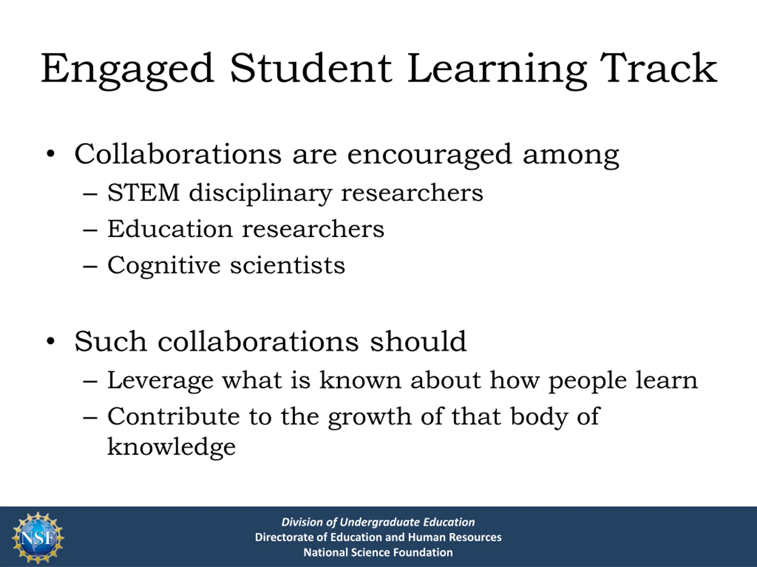 Engaged Student Learning Track Collaborations are encouraged among STEM disciplinary researchers Education researchers Cognitive scientists Such collaborations should Leverage what is known about how people learn Contribute to the growth of that body of knowledge Division of Undergraduate Education Directorate of Education and Human Resources National Science Foundation