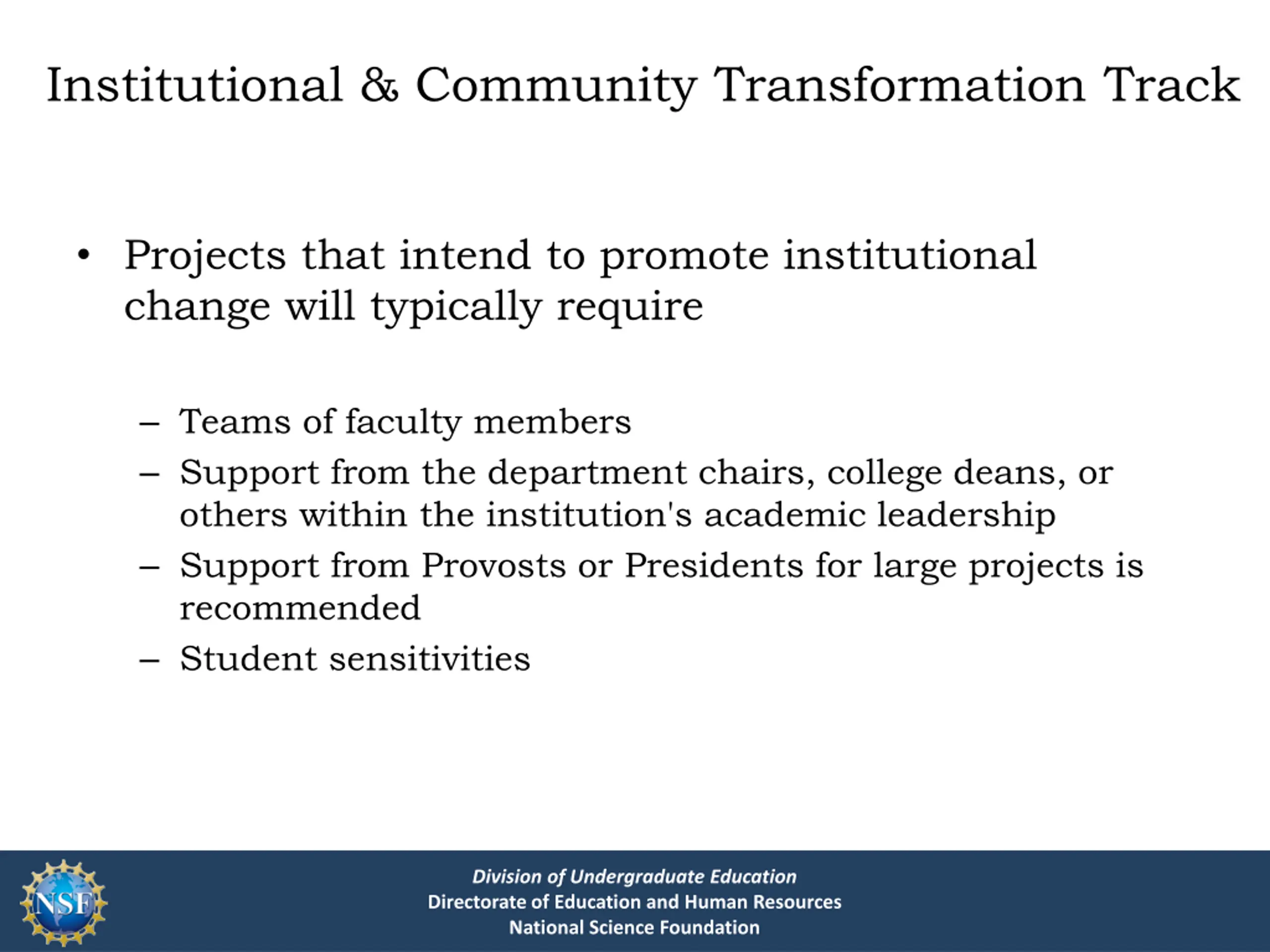 Institutional & Community Transformation Track Projects that intend to promote institutional change will typically require Teams of faculty members Support from the department chairs, college deans, or others within the institution's academic leadership Support from Provosts or Presidents for large projects is recommended Student sensitivities Division of Undergraduate Education Directorate of Education and Human Resources National Science Foundation