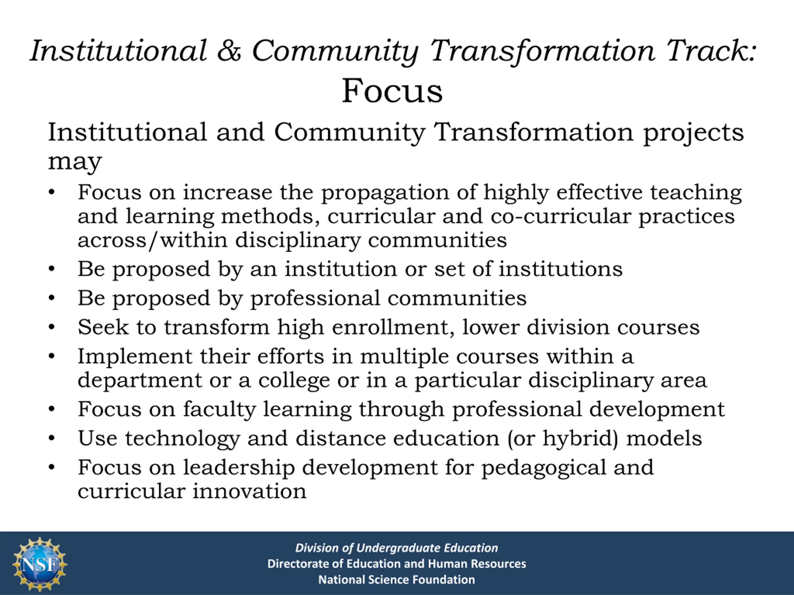 Institutional & Community Transformation Track: Focus Institutional and Community Transformation projects may Focus on increase the propagation of highly effective teaching and learning methods, curricular and co-curricular practices across/within disciplinary communities Be proposed by an institution or set of institutions Be proposed by professional communities Seek to transform high enrollment, lower division courses Implement their efforts in multiple courses within a department or a college or in a particular disciplinary area Focus on faculty learning through professional development Use technology and distance education (or hybrid) models Focus on leadership development for pedagogical and curricular innovation Division of Undergraduate Education Directorate of Education and Human Resources National Science Foundation