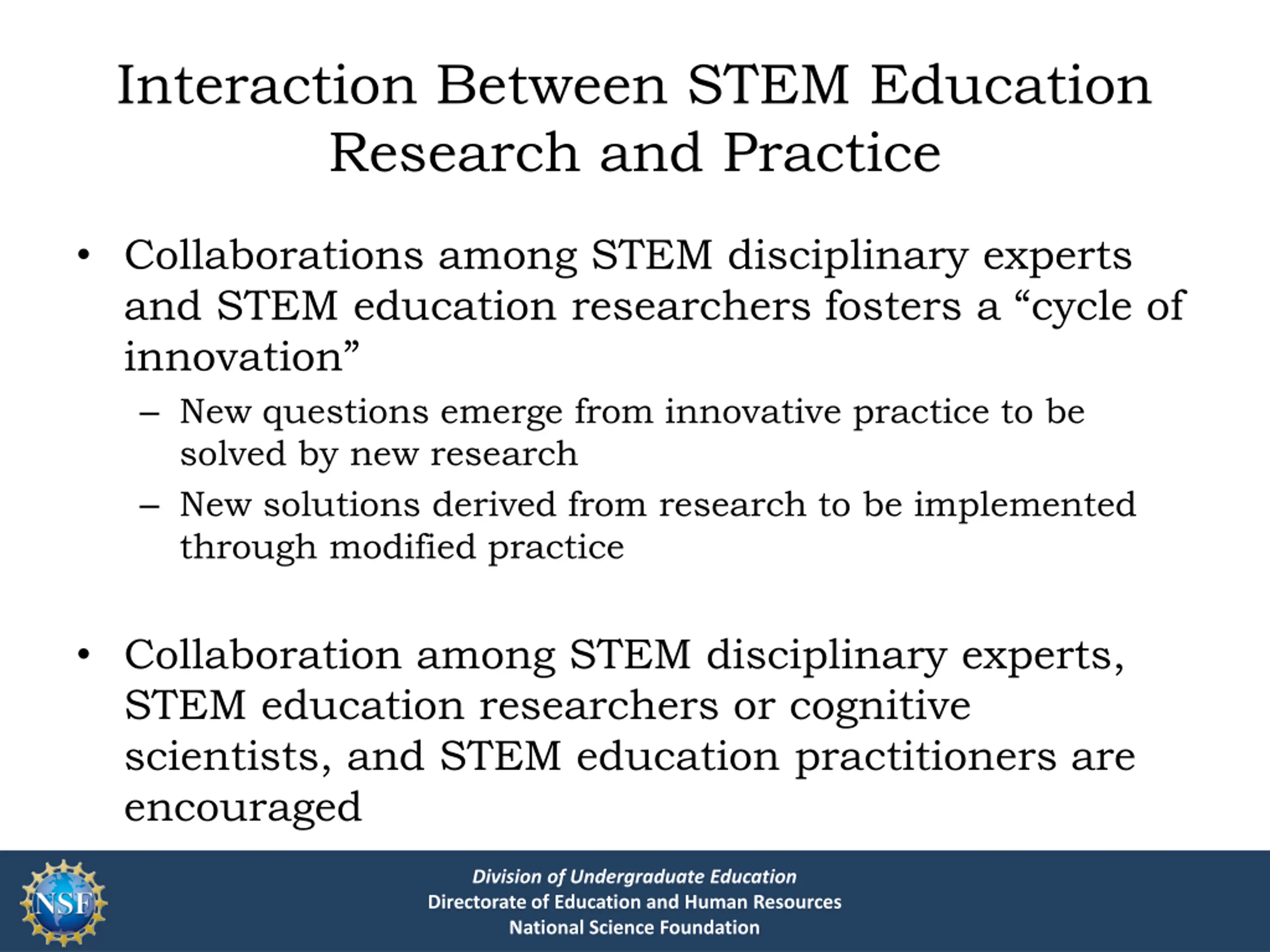 Interaction Between STEM Education Research and Practice Collaborations among STEM disciplinary experts and STEM education researchers fosters a cycle of innovation New questions emerge from innovative practice to be solved by new research New solutions derived from research to be implemented through modified practice Collaboration among STEM disciplinary experts, STEM education researchers or cognitive scientists, and STEM education practitioners are encouraged Division of Undergraduate Education Directorate of Education and Human Resources National Science Foundation