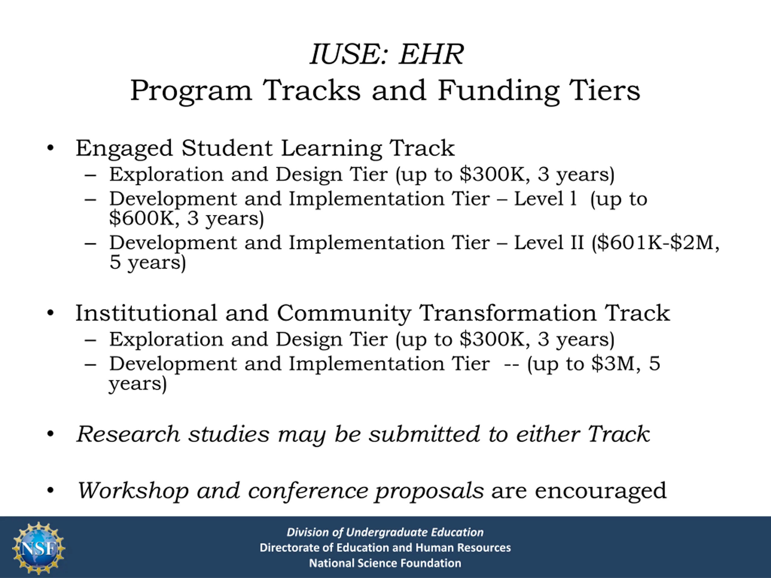 IUSE: EHR Program Tracks and Funding Tiers Engaged Student Learning Track Exploration and Design Tier (up to $300K, 3 years) Development and Implementation Tier Level l (up to $600K, 3 years) Development and Implementation Tier Level II ($601K-$2M, 5 years) Institutional and Community Transformation Track Exploration and Design Tier (up to $300K, 3 years) Development and Implementation Tier -- (up to $3M, 5 years) Research studies may be submitted to either Track Workshop and conference proposals are encouraged Division of Undergraduate Education Directorate of Education and Human Resources National Science Foundation